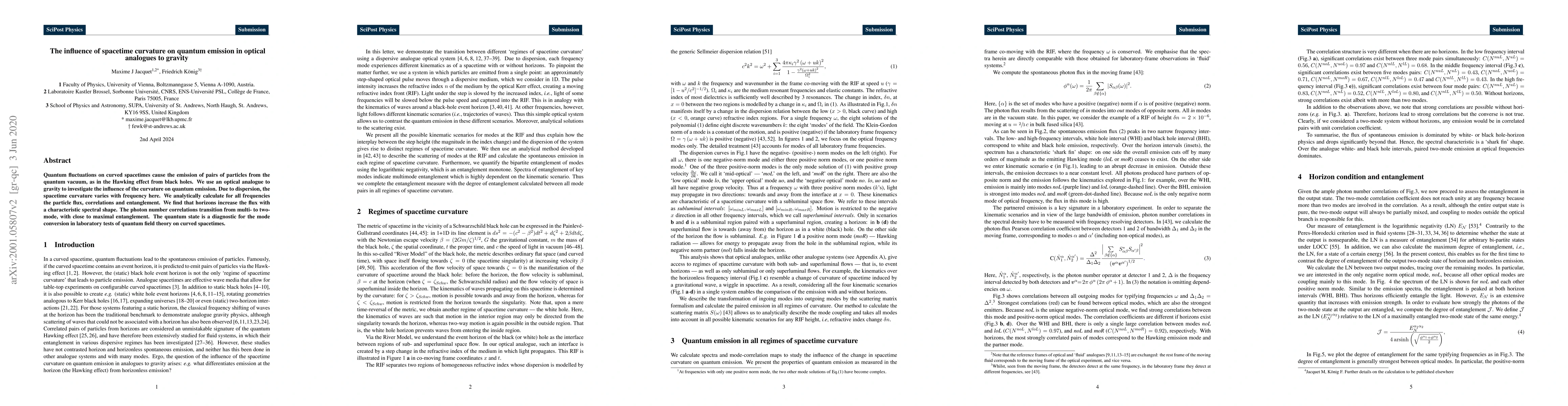Research investigates how spacetime curvature affects particle emission in optical analogues to gravity, finding that horizons increase flux with a characteristic spectral shape and near-maximal entanglement.