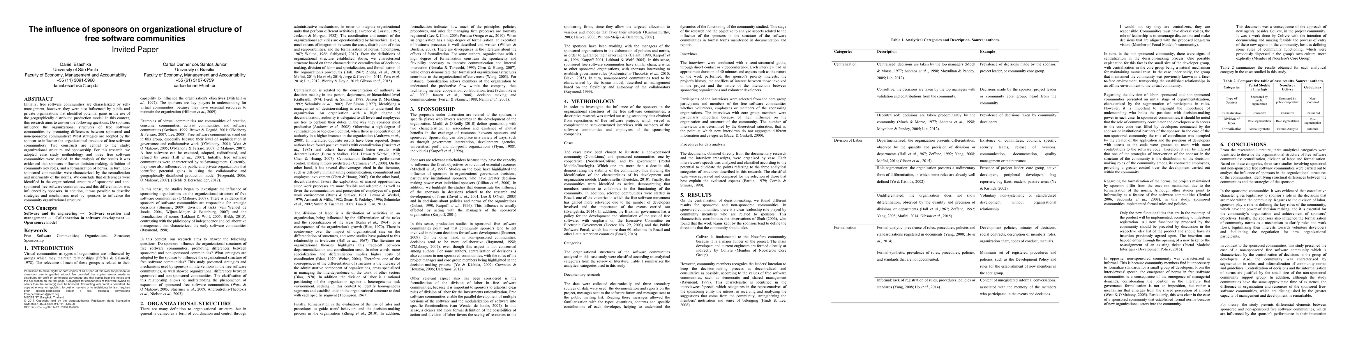 Initially, free software communities are characterized by selfmanagement, however, they were also influenced by public and private organizations that identified potential gains in the use of the geographically distributed production model. In this context, this research aims to answer the following questions: Do sponsors influence the organizational structures of free software communities by promoting differences between sponsored and non-sponsored communities? What strategies are adopted by the sponsor to influence the organizational structure of free software communities? Two constructs are central to the study: organizational structure and sponsorship. For this research, we adopted case study methodology and three free software communities were studied. In the analysis of the results it was evidenced that sponsors influence decision making, definition of community key roles, and a formalization of norms. In turn, nonsponsored communities were characterized by the centralization and informality of the norms. We conclude that differences were identified in the organizational structure of sponsored and nonsponsored free software communities, and this differentiation was influenced by sponsors. In addition, it was possible to describe strategies and mechanisms used by sponsors to influence the community organizational structure.