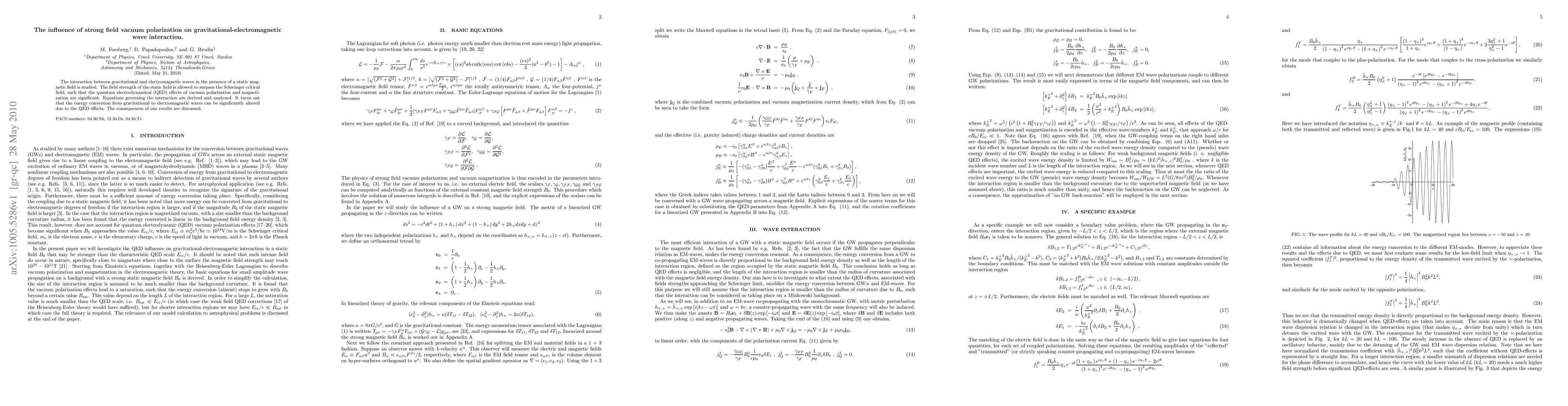 This paper investigates how strong field vacuum polarization affects the interaction between gravitational and electromagnetic waves in a static magnetic field exceeding the Schwinger critical field, revealing significant quantum electrodynamical (QED) effects that alter energy conversion between these waves. The derived equations and analysis highlight the implications of these QED effects.