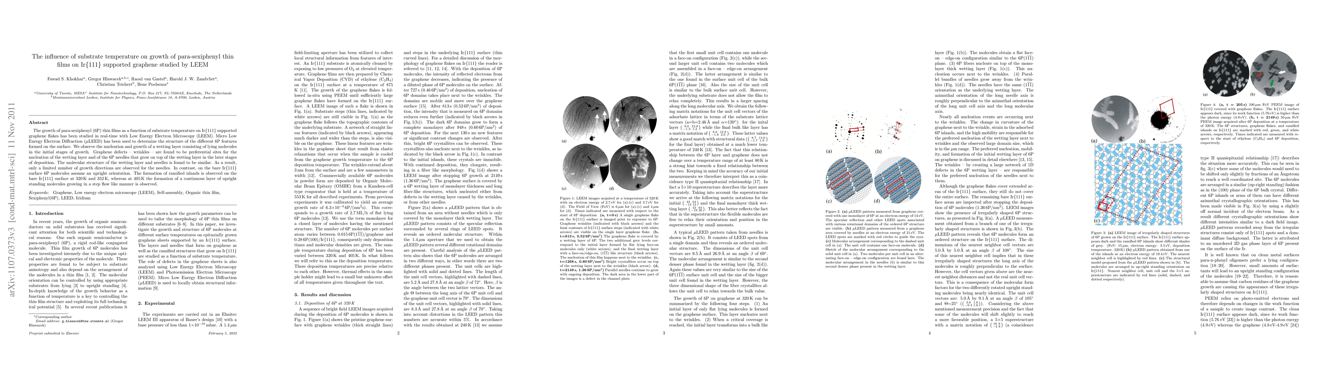 This study investigates the real-time growth of para-sexiphenyl thin films on Ir{111} supported graphene using LEEM, revealing that graphene defects promote nucleation of a lying molecule wetting layer and subsequent needle growth, while on bare Ir{111}, upright standing molecules form ramified islands or a continuous layer at different temperatures.