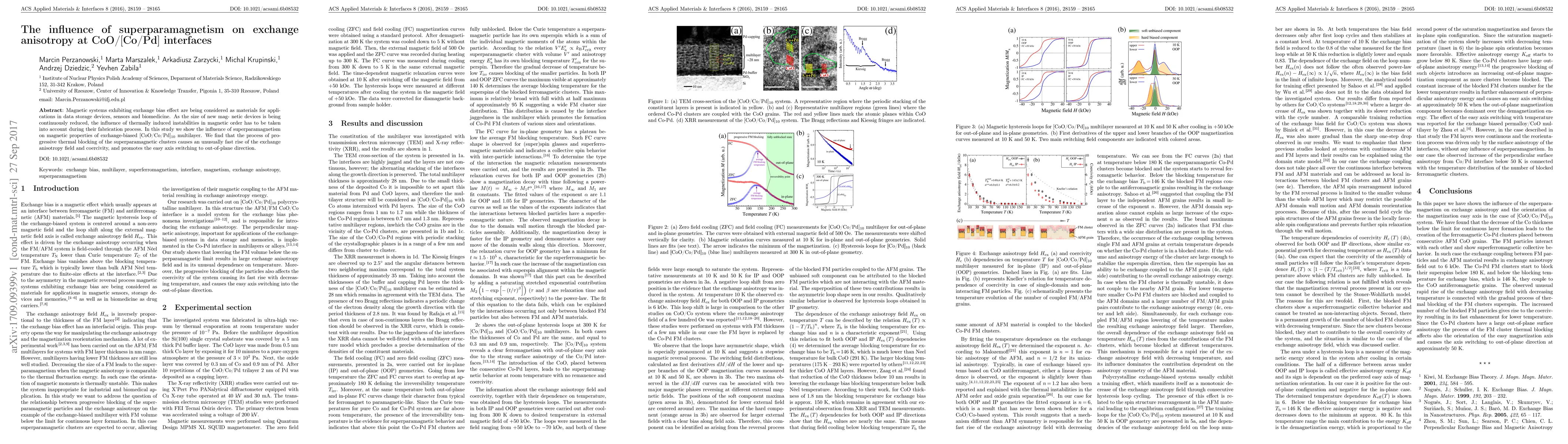 Magnetic systems exhibiting exchange bias effect are being considered as materials for applications in data storage devices, sensors and biomedicine. As the size of new mag- netic devices is being continuously reduced, the influence of thermally induced instabilities in magnetic order has to be taken into account during their fabrication process. In this study we show the influence of superparamagnetism on magnetic properties of exchange-biased [CoO/Co/Pd]10 multilayer. We find that the process of progressive thermal blocking of the superparamagnetic clusters causes an unusually fast rise of the exchange anisotropy field and coercivity, and promotes the easy axis switching to out-of-plane direction.