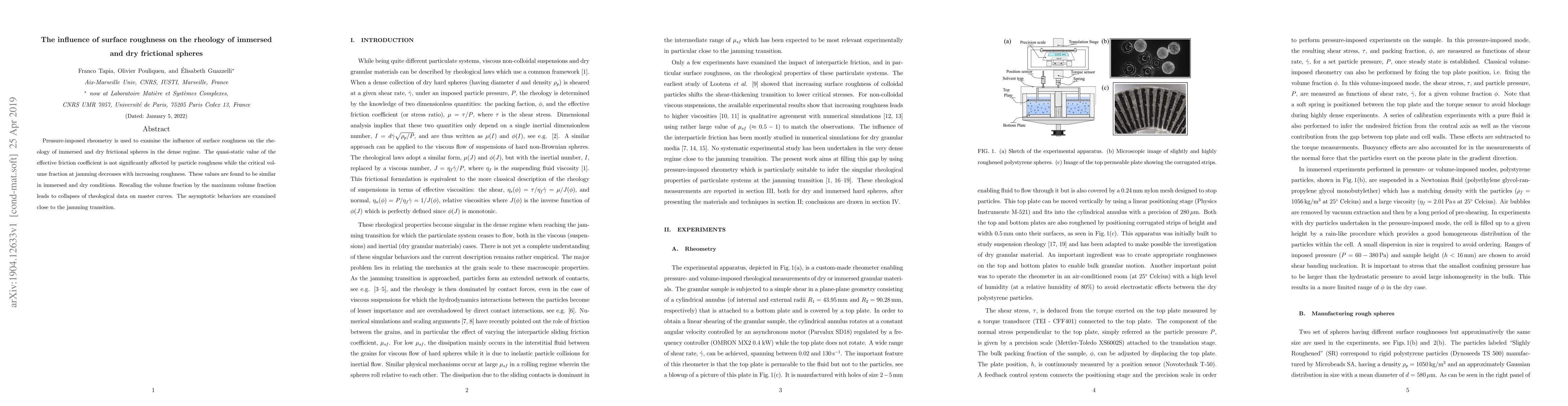 This study investigates how surface roughness impacts the rheology of frictional spheres, both immersed and dry, using pressure-imposed rheometry. The effective friction coefficient remains largely unaffected by roughness, while the critical jamming volume fraction decreases with increased roughness, with similar trends observed in both conditions.
