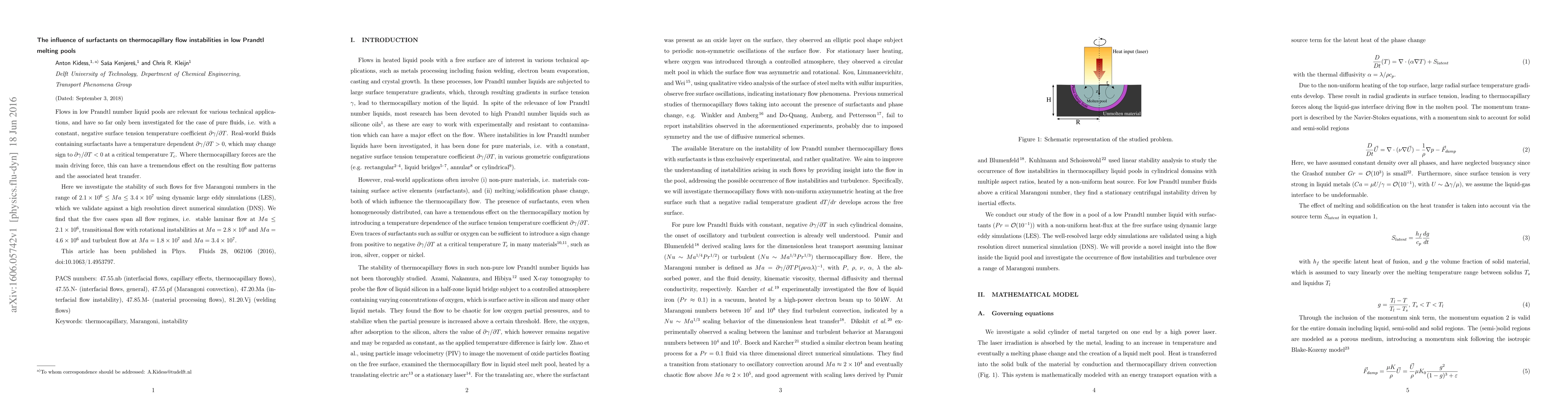 This paper investigates the influence of surfactants on thermocapillary flow instabilities in low Prandtl number melting pools, finding that varying surface tension due to temperature-dependent surfactants significantly alters flow regimes from laminar to turbulent across different Marangoni numbers. The study uses dynamic large eddy simulations validated by high-resolution direct numerical simulations.
