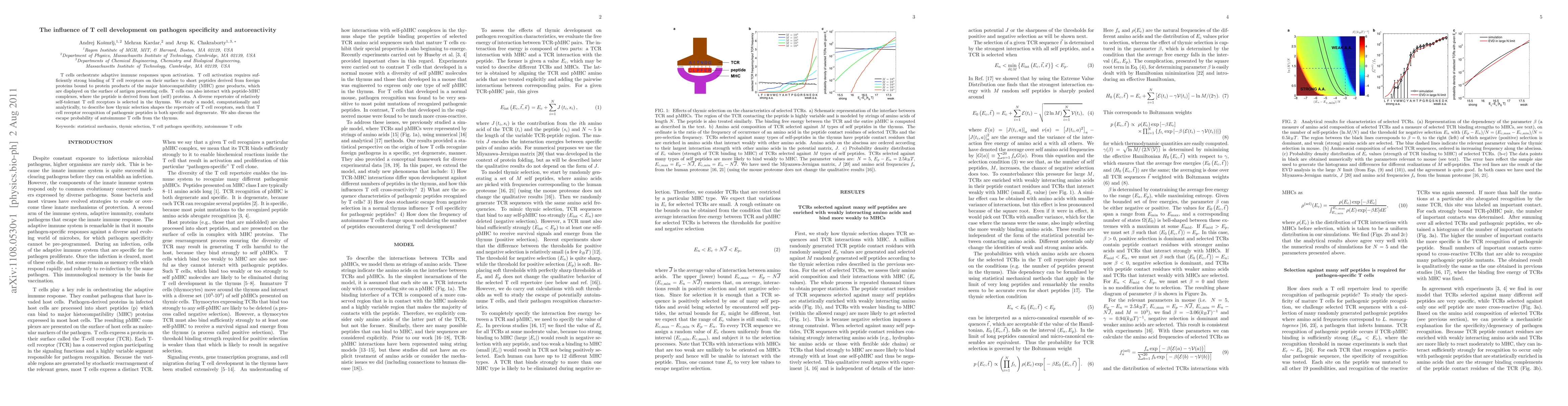 This paper investigates the thymic selection process that shapes T cell receptor repertoires, ensuring pathogen specificity and minimizing autoreactivity. It combines computational and analytical models to explore how T cell development influences both effective immune responses against pathogens and the prevention of autoimmune reactions.