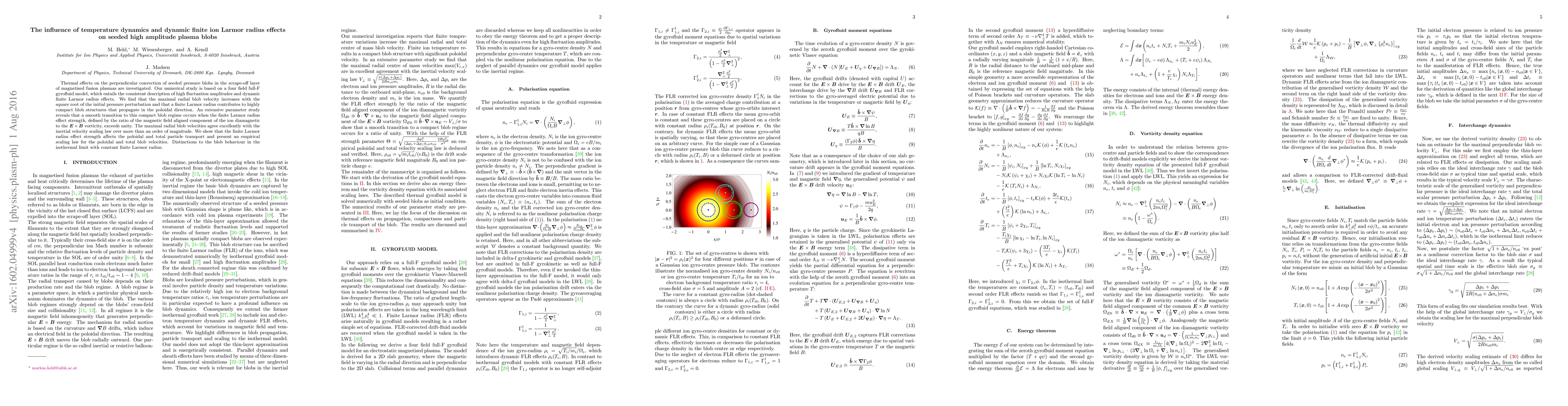 This paper investigates the influence of temperature dynamics and finite Larmor radius effects on high amplitude plasma blobs in fusion plasmas using a four-field gyrofluid model. The study finds that maximal radial blob velocities increase with the square root of initial pressure perturbations and that finite Larmor radius effects lead to compact blob structures propagating in the poloidal direction.