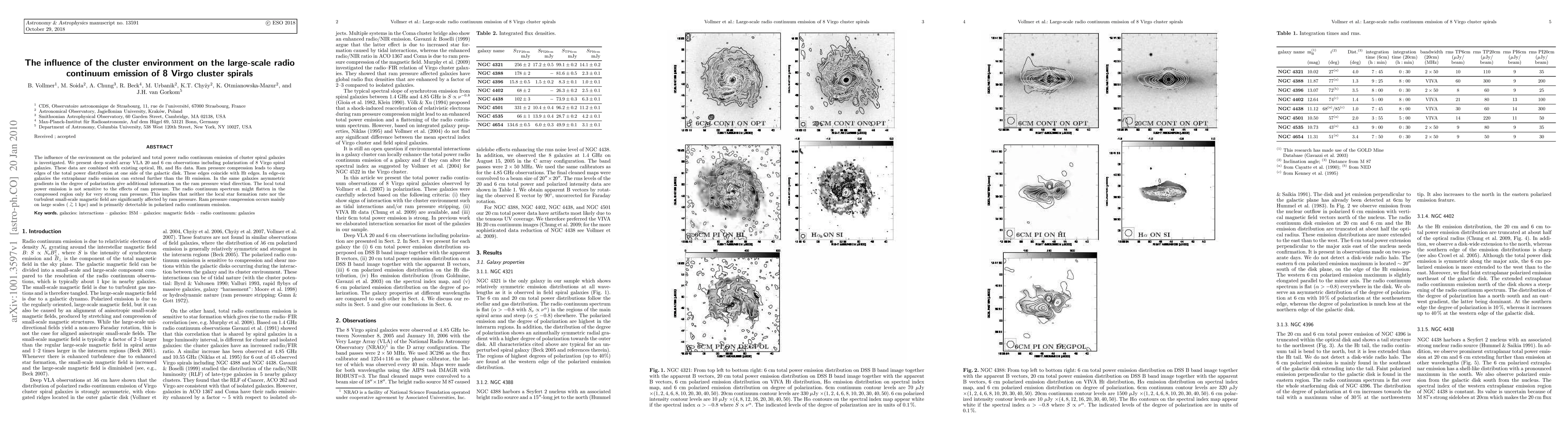 The influence of the environment on the polarized and total power radio continuum emission of cluster spiral galaxies is investigated. We present deep scaled array VLA 20 and 6 cm observations including polarization of 8 Virgo spiral galaxies. These data are combined with existing optical, HI, and Halpha data. Ram pressure compression leads to sharp edges of the total power distribution at one side of the galactic disk. These edges coincide with HI edges. In edge-on galaxies the extraplanar radio emission can extend further than the HI emission. In the same galaxies asymmetric gradients in the degree of polarization give additional information on the ram pressure wind direction. The local total power emission is not sensitive to the effects of ram pressure. The radio continuum spectrum might flatten in the compressed region only for very strong ram pressure. This implies that neither the local star formation rate nor the turbulent small-scale magnetic field are significantly affected by ram pressure. Ram pressure compression occurs mainly on large scales (>=1 kpc) and is primarily detectable in polarized radio continuum emission.