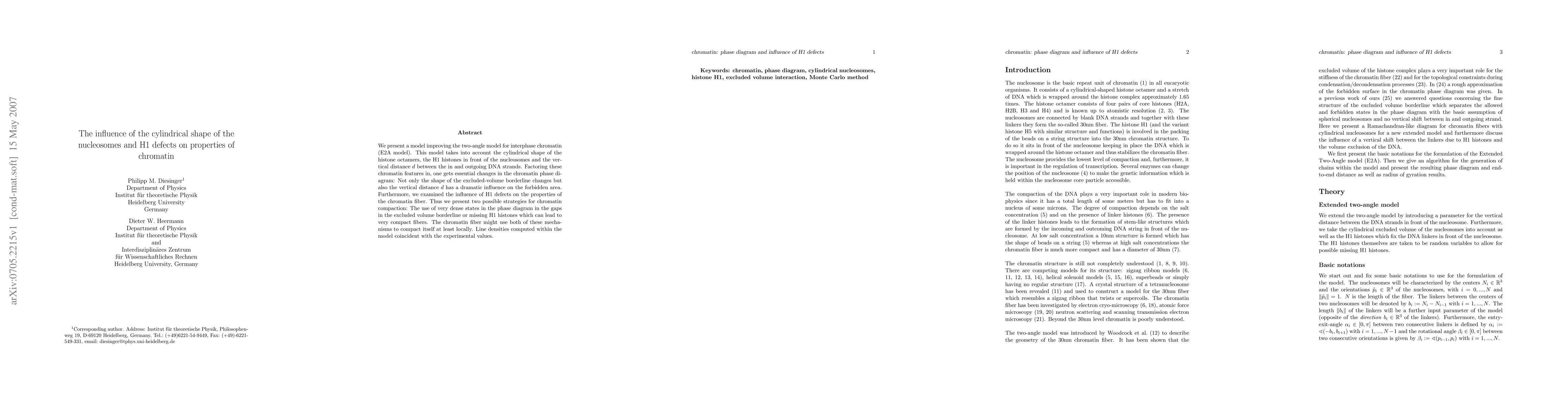 We present a model improving the two-angle model for interphase chromatin (E2A model). This model takes into account the cylindrical shape of the histone octamers, the H1 histones in front of the nucleosomes and the vertical distance $d$ between the in and outgoing DNA strands. Factoring these chromatin features in, one gets essential changes in the chromatin phase diagram: Not only the shape of the excluded-volume borderline changes but also the vertical distance $d$ has a dramatic influence on the forbidden area. Furthermore, we examined the influence of H1 defects on the properties of the chromatin fiber. Thus we present two possible strategies for chromatin compaction: The use of very dense states in the phase diagram in the gaps in the excluded volume borderline or missing H1 histones which can lead to very compact fibers. The chromatin fiber might use both of these mechanisms to compact itself at least locally. Line densities computed within the model coincident with the experimental values.