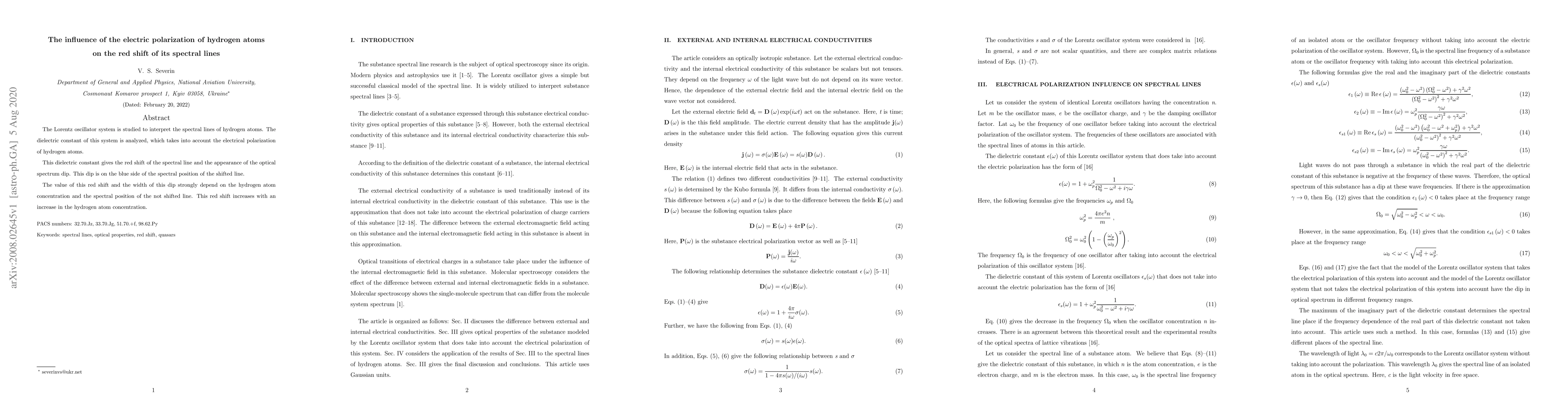 This study investigates the Lorentz oscillator model to explain the spectral lines of hydrogen atoms, revealing that the electric polarization of hydrogen atoms causes a red shift in spectral lines and the appearance of an optical spectrum dip on the blue side. The magnitude of the red shift and the width of the dip are influenced by hydrogen atom concentration and the position of the unshifted spectral line.