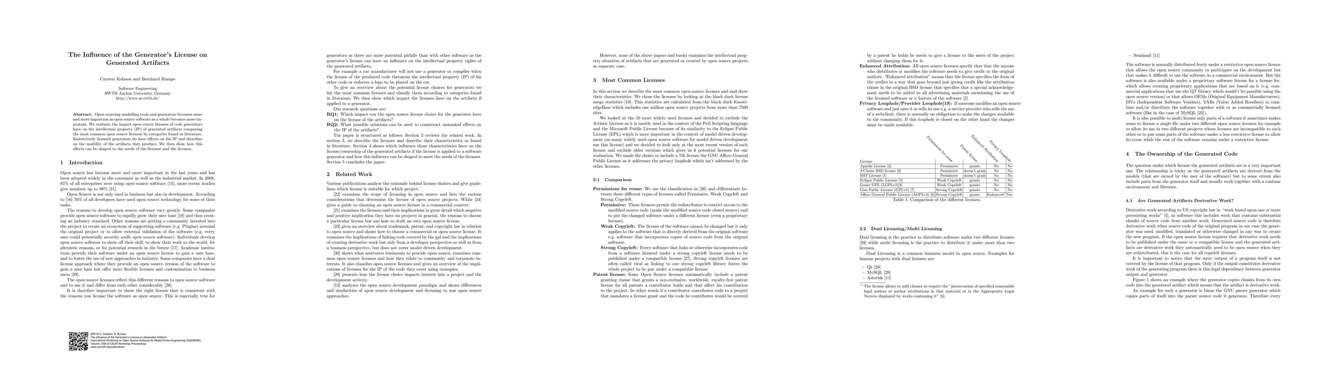 Open sourcing modelling tools and generators becomes more and more important as open source software as a whole becomes more important. We evaluate the impact open source licenses of code generators have on the intellectual property (IP) of generated artifacts comparing the most common open source licenses by categories found in literature. Restrictively licensed generators do have effects on the IP and therefore on the usability of the artifacts they produce. We then how how this effects can be shaped to the needs of the licensor and the licensee.