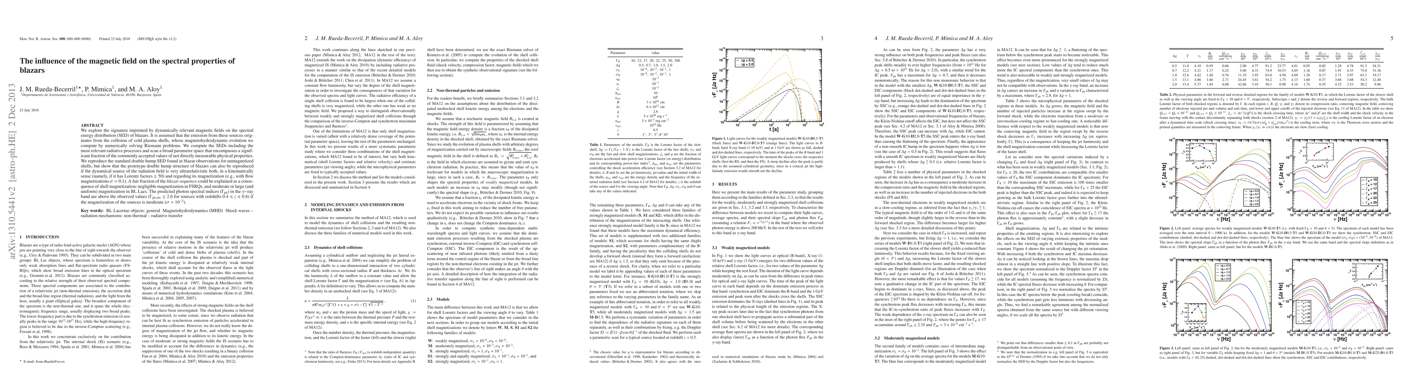 We explore the signature imprinted by dynamically relevant magnetic fields on the spectral energy distribution (SED) of blazars. It is assumed that the emission from these sources originates from the collision of cold plasma shells, whose magnetohydrodynamic evolution we compute by numerically solving Riemann problems. We compute the SEDs including the most relevant radiative processes and scan a broad parameter space that encompasses a significant fraction of the commonly accepted values of not directly measurable physical properties. We reproduce the standard double hump SED found in blazar observations for unmagnetized shells, but show that the prototype double hump structure of blazars can also be reproduced if the dynamical source of the radiation field is very ultrarelativistic both, in a kinematically sense (namely, if it has Lorentz factors \gtrsim 50) and regarding its magnetization (e.g., with flow magnetizations \sigma \simeq 0.1). A fair fraction of the {\em blazar sequence} could be explained as a consequence of shell magnetization: negligible magnetization in FSRQs, and moderate or large (and uniform) magnetization in BL Lacs. The predicted photon spectral indices (\gph) in the \gamma-ray band are above the observed values (\Gamma_{\rm ph, obs} \lesssim 2.6 for sources with redshifts 0.4\le z \le 0.6) if the magnetization of the sources is moderate (\sigma \simeq 10^{-2}).