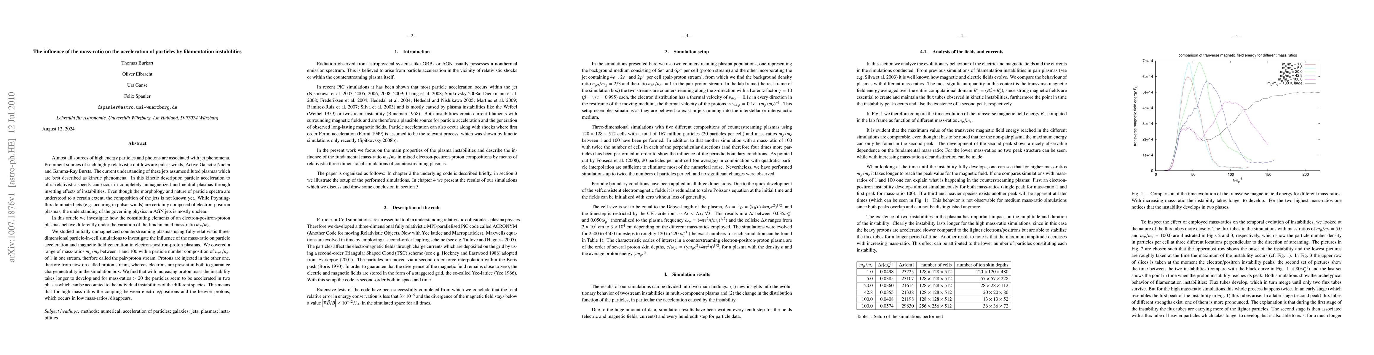 Almost all sources of high energy particles and photons are associated with jet phenomena. Prominent sources of such highly relativistic outflows are pulsar winds and Active Galactic Nuclei. The current understanding of these jets assumes diluted plasmas which are best described as kinetic phenomena. In this kinetic description particle acceleration to ultra-relativistic speeds can occur in completely unmagnetized and neutral plasmas through insetting effects of instabilities. Even though the morphology and nature of particle spectra are understood to a certain extent, the composition of the jets is not known yet. While Poynting-flux dominated jets are certainly composed of electron-positron plasmas, the understanding of the governing physics in AGN jets is mostly unclear. In this article we investigate how the constituting elements of an electron-positron-proton plasma behave differently under the variation of the fundamental mass-ratio m_p/m_e. We studied initially unmagnetized counterstreaming plasmas using fully relativistic three-dimensional particle-in-cell simulations to investigate the influence of the mass-ratio on particle acceleration and magnetic field generation in electron-positron-proton plasmas. We covered a range of mass-ratios m_p/m_e between 1 and 100 with a particle number composition of n_{p^+}/n_{e^+} of 1 in one stream, only protons are injected in the other, whereas electrons are present in both to guarantee charge neutrality in the simulation box. We find that with increasing proton mass the instability takes longer to develop and for mass-ratios > 20 the particles seem to be accelerated in two phases which can be accounted to the individual instabilities of the different species. This means that for high mass ratios the coupling between electrons/positrons and the heavier protons, which occurs in low mass-ratios, disappears.