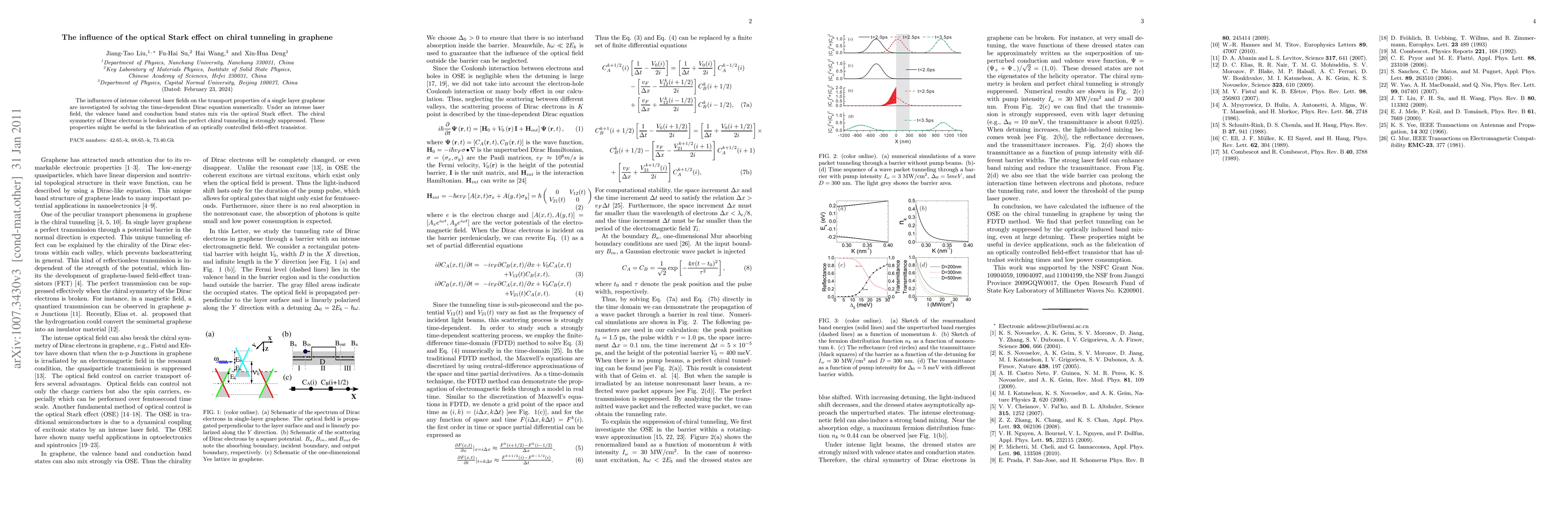 Summary: This study investigates how intense coherent laser fields affect the transport properties of graphene, revealing that the optical Stark effect mixes valence and conduction band states, thereby breaking chiral symmetry and significantly suppressing perfect chiral tunneling.