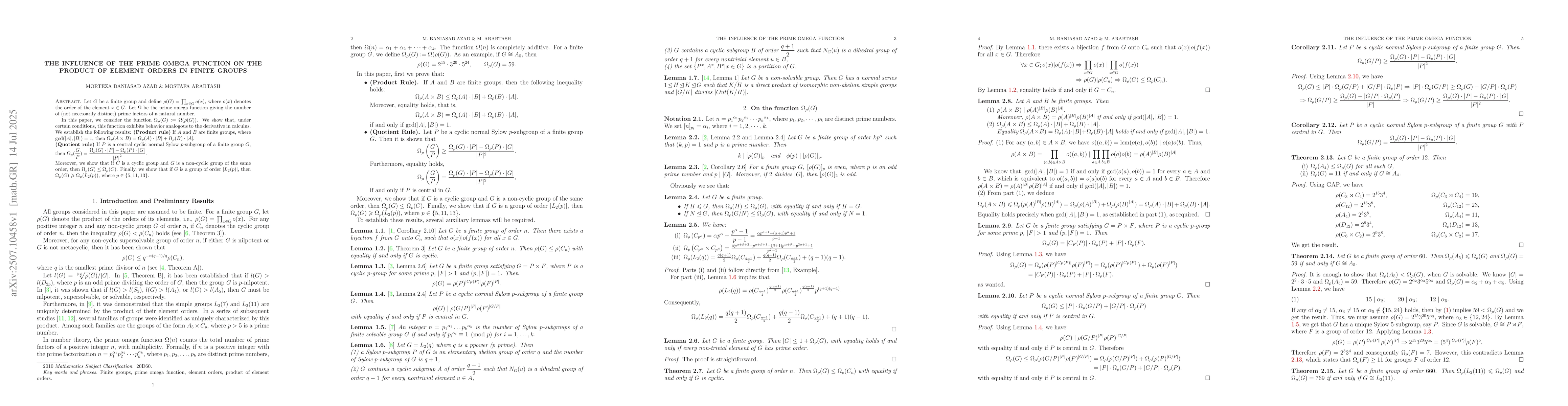 Let $G$ be a finite group and define $\rho(G) = \prod_{x \in G} o(x)$, where $o(x)$ denotes the order of the element $x \in G$. Let $\Omega$ be the prime omega function giving the number of (not necessarily distinct) prime factors of a natural number. In this paper, we consider the function $\Omega_{\rho}(G):= \Omega(\rho(G))$. We show that, under certain conditions, this function exhibits behavior analogous to the derivative in calculus. We establish the following results: \textbf{(Product rule)} If $A$ and $B$ are finite groups, where $\operatorname{gcd}(|A|,|B|)=1$, then $\Omega_{\rho}(A\times B) = \Omega_{\rho}(A) \cdot |B|+\Omega_{\rho}(B) \cdot |A|$. \\ \textbf{(Quotient rule)} If $P$ is a central cyclic normal Sylow $p$-subgroup of a finite group $G$, then $ \Omega_{\rho}(\dfrac{G}{P}) = \dfrac{\Omega_{\rho}(G)\cdot|P|-\Omega_{\rho}(P)\cdot |G|}{{|P|}^2}.$ \\ Moreover, we show that if $C$ is a cyclic group and $G$ is a non-cyclic group of the same order, then $\Omega_{\rho}(G) \leq \Omega_{\rho}(C)$. Finally, we show that if $G$ is a group of order $|L_2(p)|$, then $\Omega_{\rho}(G) \geqslant \Omega_{\rho}(L_2(p))$, where $p \in \{5, 11, 13\} $.