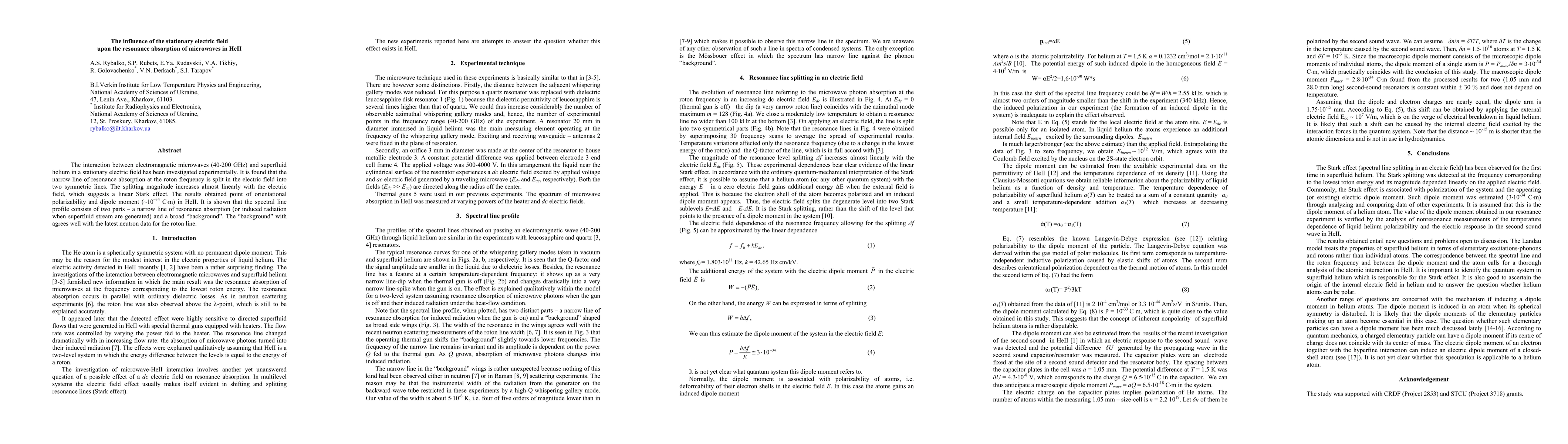 The interaction between electromagnetic microwaves (40-200 GHz) and superfluid helium in a stationary electric field has been investigated experimentally. It is found that the narrow line of resonance absorption at the roton frequency is split in the electric field into two symmetric lines. The splitting magnitude increases almost linearly with the electric field, which suggests a linear Stark effect. The results obtained point of orientational polarizability and dipole moment (10^(-34)C*m) in HeII. It is shown that the spectral line profile consists of two parts - a narrow line of resonance absorption (or induced radiation when superfluid stream are generated) and a broad background. The background with agrees well with the latest neutron data for the roton line.