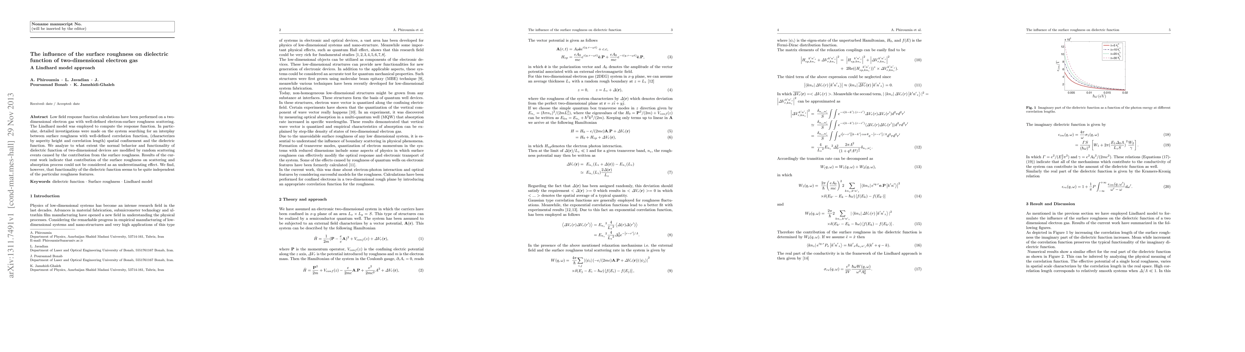 This paper investigates how surface roughness affects the dielectric function of a two-dimensional electron gas, finding that scattering due to surface roughness significantly impacts the absorption process but does not alter the fundamental functionality of the dielectric function. The study uses the Lindhard model to analyze the interplay between surface roughness and the system's response.