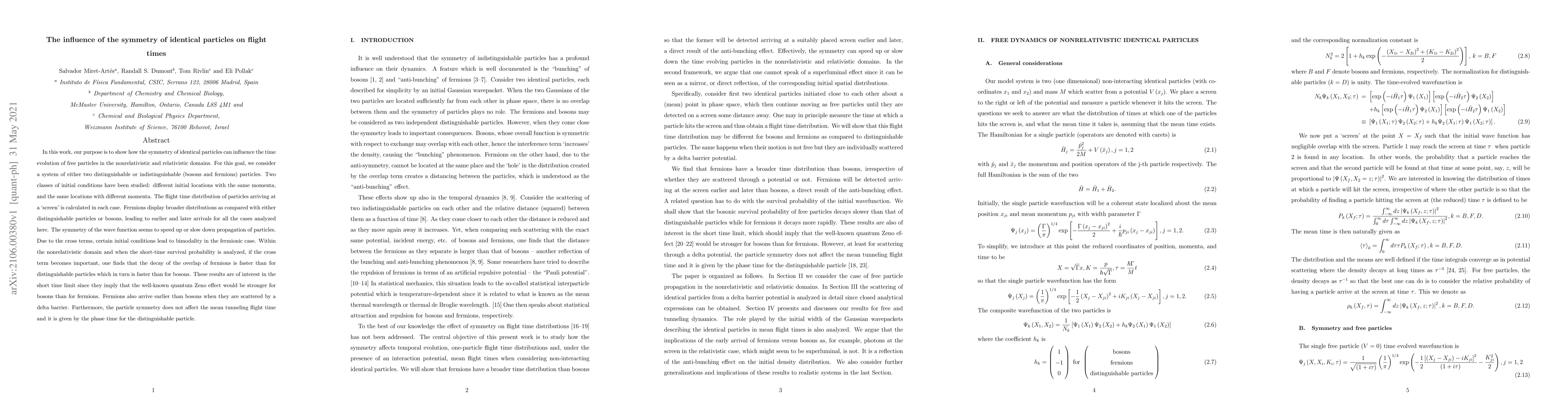 This paper investigates how the symmetry of identical particles affects their flight times in nonrelativistic and relativistic domains. It finds that fermionic particles exhibit broader flight time distributions compared to distinguishable particles or bosons, leading to earlier and later arrivals. The symmetry of the wave function influences particle propagation, with cross terms causing bimodality in the fermionic case.