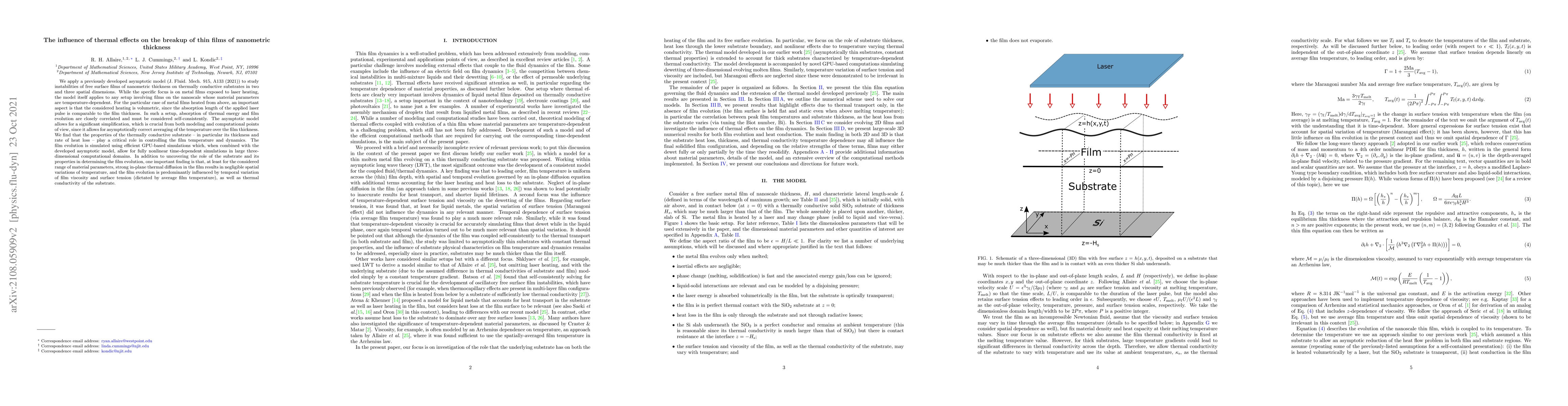 We apply a previously developed asymptotic model (J. Fluid. Mech. 915, A133 (2021)) to study instabilities of free surface films of nanometric thickness on thermally conductive substrates in two and three spatial dimensions. While the specific focus is on metal films exposed to laser heating, the model itself applies to any setup involving films on the nanoscale whose material parameters are temperature-dependent. For the particular case of metal films heated from above, an important aspect is that the considered heating is volumetric, since the absorption length of the applied laser pulse is comparable to the film thickness. In such a setup, absorption of thermal energy and film evolution are closely correlated and must be considered self-consistently. The asymptotic model allows for a significant simplification, which is crucial from both modeling and computational points of view, since it allows for asymptotically correct averaging of the temperature over the film thickness. We find that the properties of the thermally conductive substrate -- in particular its thickness and rate of heat loss -- play a critical role in controlling the film temperature and dynamics. The film evolution is simulated using efficient GPU-based simulations which, when combined with the developed asymptotic model, allow for fully nonlinear time-dependent simulations in large three-dimensional computational domains. In addition to uncovering the role of the substrate and its properties in determining the film evolution, one important finding is that, at least for the considered range of material parameters, strong in-plane thermal diffusion in the film results in negligible spatial variations of temperature, and the film evolution is predominantly influenced by temporal variation of film viscosity and surface tension (dictated by average film temperature), as well as thermal conductivity of the substrate.