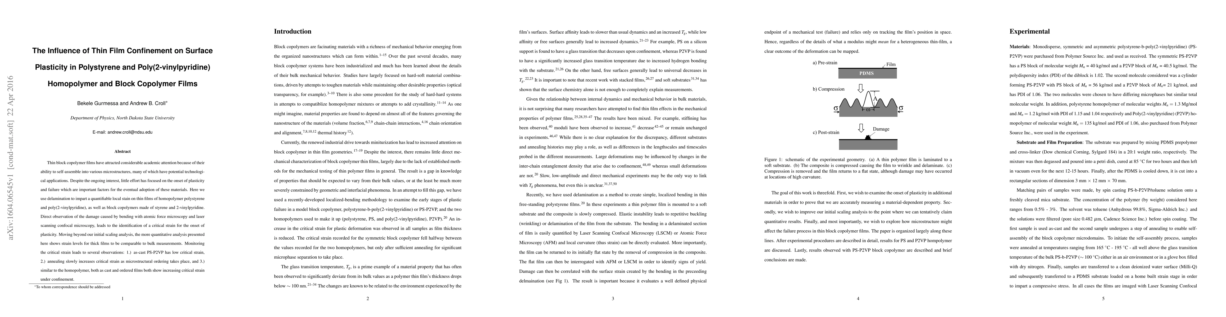 Thin block copolymer films have attracted considerable academic attention because of their ability to self-assemble into various microstructures, many of which have potential technological applications. Despite the ongoing interest, little effort has focused on the onset of plasticity and failure which are important factors for the eventual adoption of these materials. Here we use delamination to impart a quantifiable local stain on thin films of homopolymer polystyrene and poly(2-vinylpyridine), as well as block copolymers made of styrene and 2-vinylpyridine. Direct observation of the damage caused by bending with atomic force microscopy and laser scanning confocal microscopy, leads to the identification of a critical strain for the onset of plasticity. Moving beyond our initial scaling analysis, the more quantitative analysis presented here shows strain levels for thick films to be comparable to bulk measurements. Monitoring the critical strain leads to several observations: 1.) as-cast PS-P2VP has low critical strain, 2.) annealing slowly increases critical strain as microstructural ordering takes place, and 3.) similar to the homopolymer, both as cast and ordered films both show increasing critical strain under confinement.