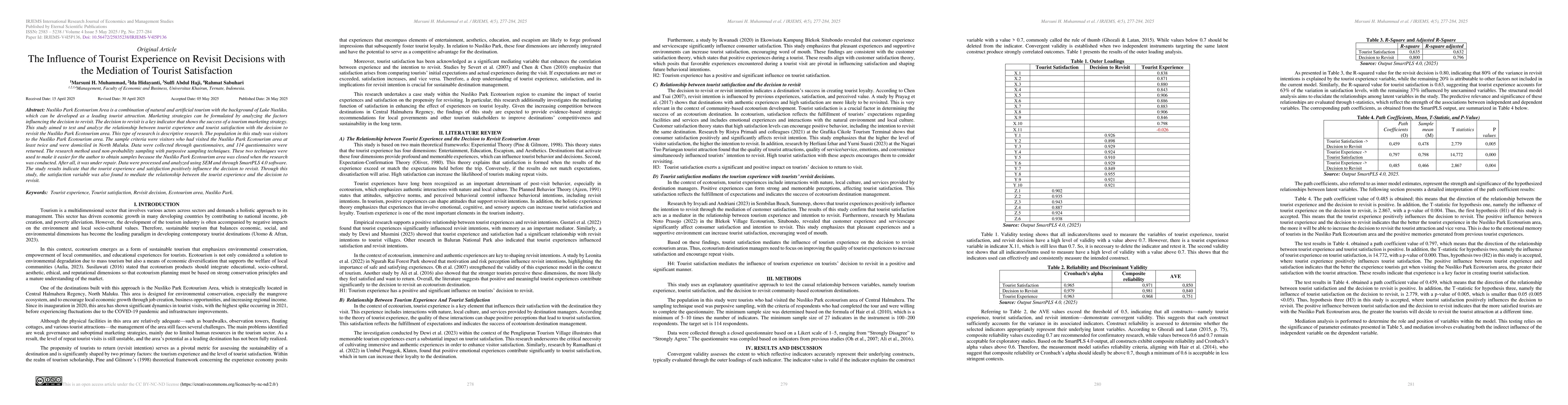 This study examines how tourist experience affects revisit decisions at Nusliko Park Ecotourism Area, finding that both positive experiences and satisfaction influence revisitation intentions, with satisfaction as a mediator.