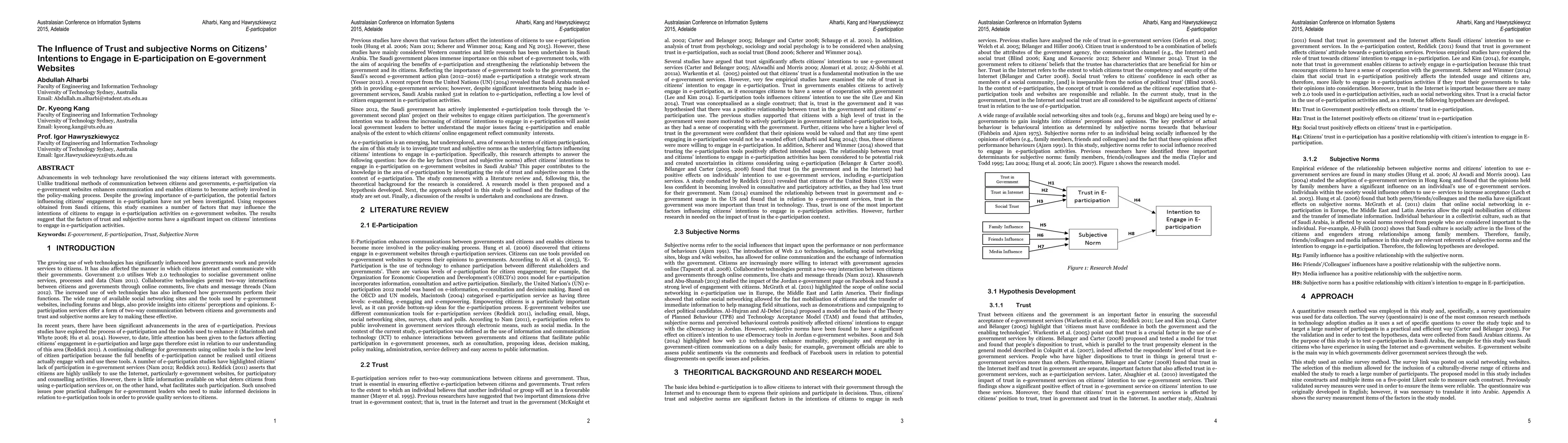 This study investigates the influence of trust and subjective norms on Saudi citizens' intentions to engage in e-participation on e-government websites. Findings reveal that both trust in the government and perceived social pressure significantly affect citizens' willingness to participate online in policy-making.