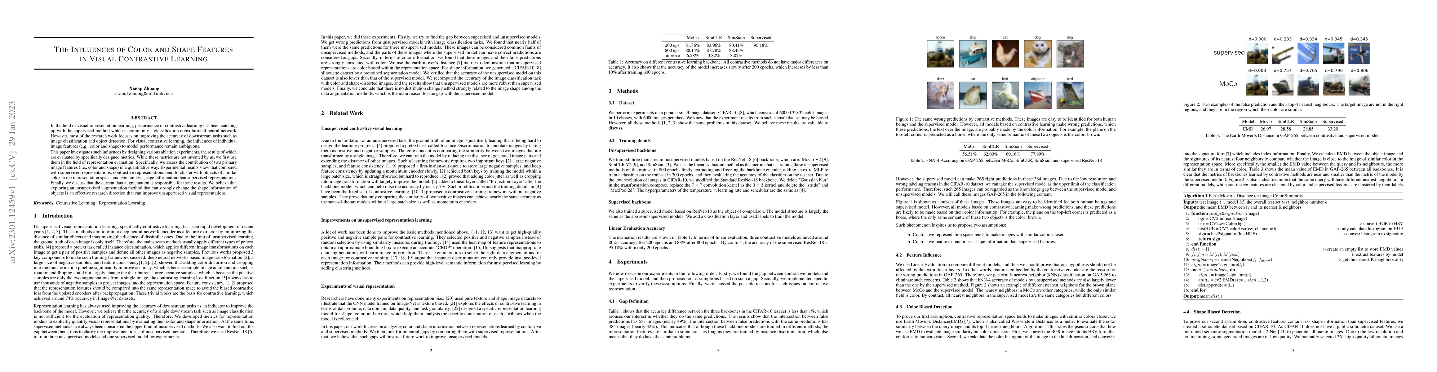 This paper investigates how color and shape features influence visual contrastive learning, finding that contrastive representations cluster by color and retain less shape information compared to supervised representations. The study suggests that current data augmentation methods may be responsible for these outcomes.