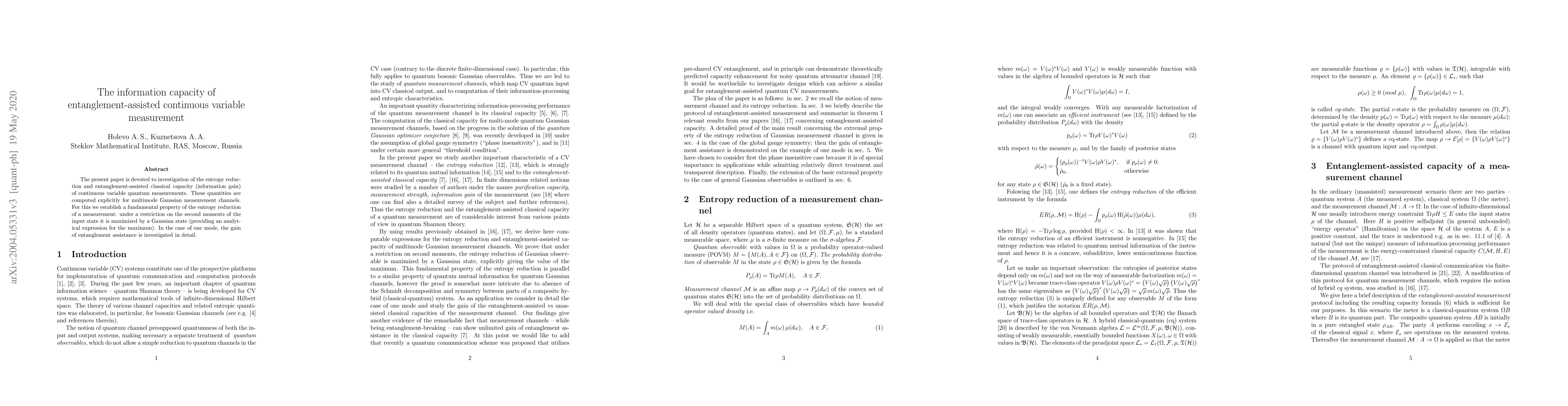 This paper investigates the entropy reduction and entanglement-assisted classical capacity in continuous variable quantum measurements, focusing on multimode Gaussian channels. It establishes that Gaussian states maximize entropy reduction under certain conditions and provides an analytical expression for this maximum.