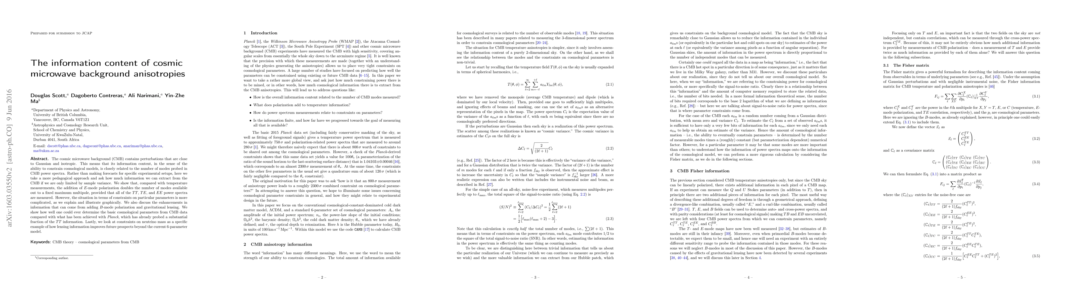 The cosmic microwave background (CMB) contains perturbations that are close to Gaussian and isotropic. This means that its information content, in the sense of the ability to constrain cosmological models, is closely related to the number of modes probed in CMB power spectra. Rather than making forecasts for specific experimental setups, here we take a more pedagogical approach and ask how much information we can extract from the CMB if we are only limited by sample variance. We show that, compared with temperature measurements, the addition of E-mode polarization doubles the number of modes available out to a fixed maximum multipole, provided that all of the TT, TE, and EE power spectra are measured. However, the situation in terms of constraints on particular parameters is more complicated, as we explain and illustrate graphically. We also discuss the enhancements in information that can come from adding B-mode polarization and gravitational lensing. We show how well one could ever determine the basic cosmological parameters from CMB data compared with what has been achieved with Planck, which has already probed a substantial fraction of the TT information. Lastly, we look at constraints on neutrino mass as a specific example of how lensing information improves future prospects beyond the current 6-parameter model.