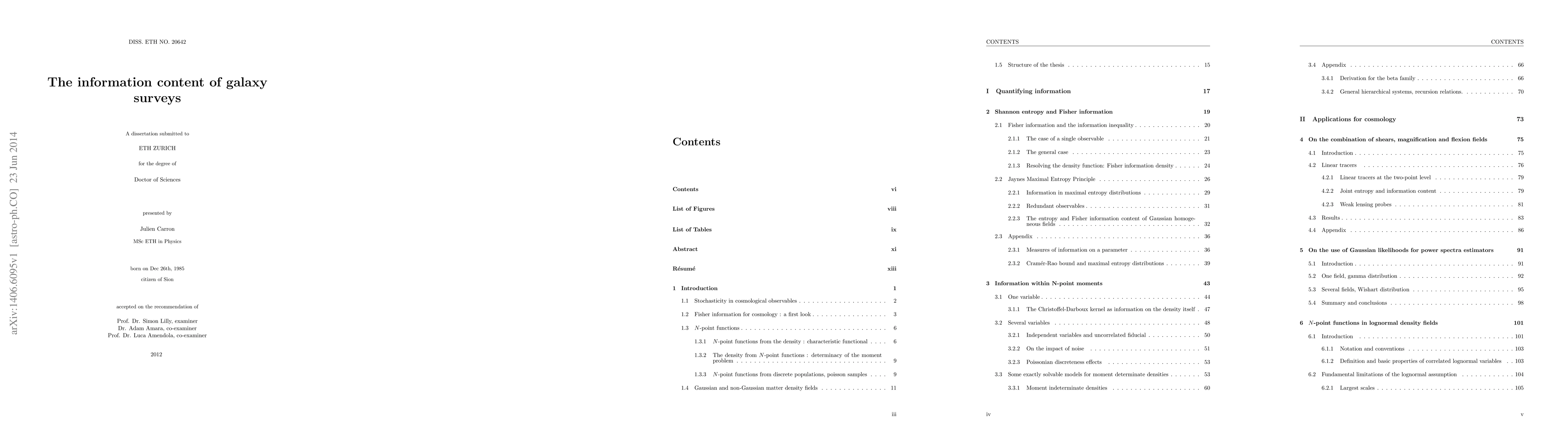 A large fraction of this thesis is dedicated to the study of the information content of random fields with heavy tails, in particular the lognormal field, a model for the matter density fluctuation field. It is well known that in the nonlinear regime of structure formation, the matter fluctuation field develops such large tails. It has also been suggested that fields with large tails are not necessarily well described by the hierarchy of $N$-point functions. In this thesis, we are able to make this last statement precise and with the help of the lognormal model to quantify precisely its implications for inference on cosmological parameters : we find as our main result that only a tiny fraction of the total Fisher information of the field is still contained in the hierarchy of $N$-point moments in the nonlinear regime, rendering parameter inference from such moments very inefficient. We show that the hierarchy fails to capture the information that is contained in the underdense regions, which at the same time are found to be the most rich in information. We find further our results to be very consistent with numerical analysis using $N$-body simulations. We also discuss these issues with the help of explicit families of fields with the same hierarchy of $N$-point moments defined in this work. A similar analysis is then applied to the convergence field, the weighted projection of the matter density fluctuation field along the line of sight, with similar conclusions. We also show how simple mappings can correct for this inadequacy, consistently with previous findings in the literature (Abridged) .