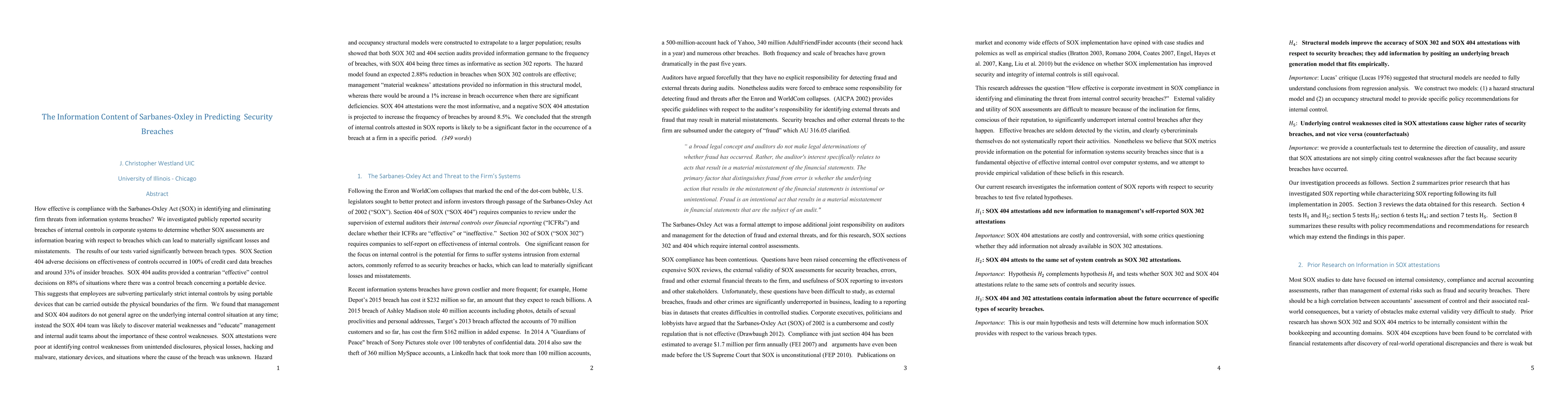 Publicly reported security breaches show that SOX assessments can predict breaches, with 100% of credit card data breaches and 88% of portable device breaches having failed controls. SOX 404 audits provided the most informative results, identifying material weaknesses and reducing breach frequency by up to 8.5%.