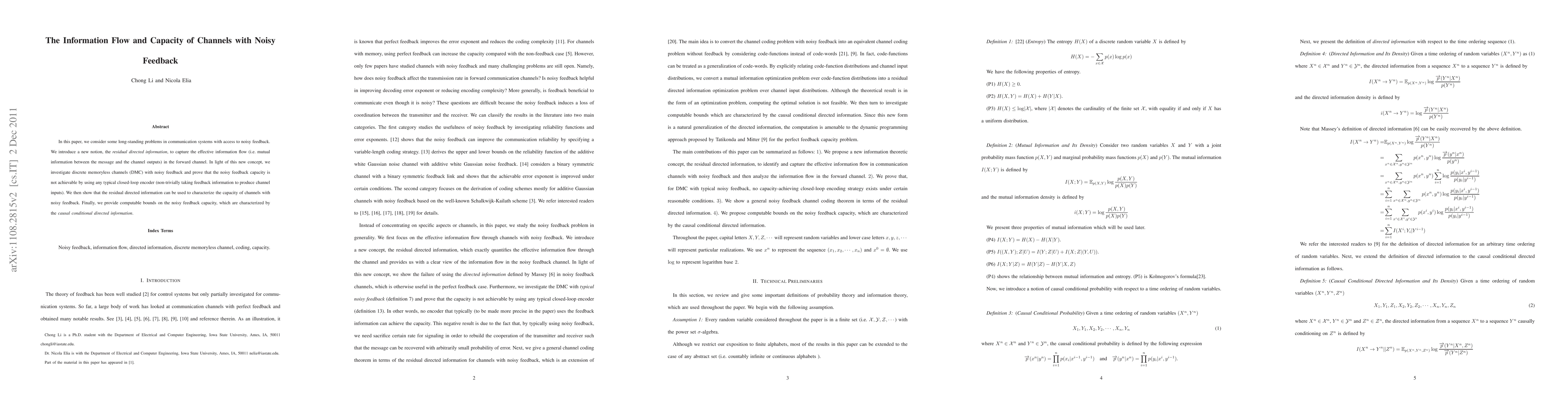 This paper introduces the concept of residual directed information to analyze information flow in communication channels with noisy feedback, demonstrating that typical closed-loop encoders cannot achieve the noisy feedback capacity. It characterizes the capacity using this new notion and provides computable bounds based on causal conditional directed information.
