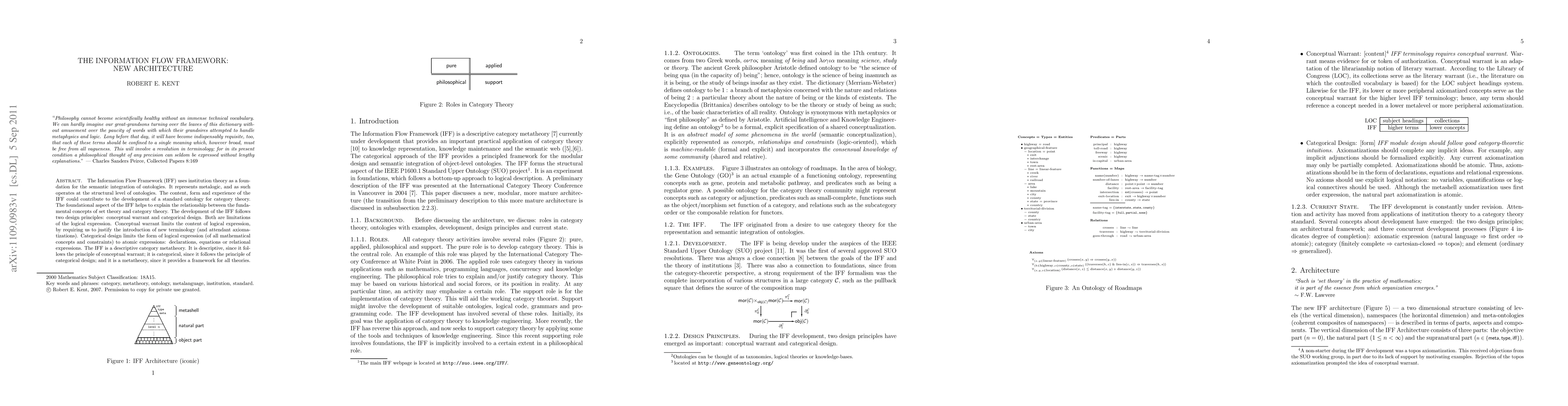 This presentation discusses a new, modular, more mature architecture for the Information Flow Framework (IFF). The IFF uses institution theory as a foundation for the semantic integration of ontologies. It represents metalogic, and as such operates at the structural level of ontologies. The content, form and experience of the IFF could contribute to the development of a standard ontology for category theory. The foundational aspect of the IFF helps to explain the relationship between the fundamental concepts of set theory and category theory. The development of the IFF follows two design principles: conceptual warrant and categorical design. Both are limitations of the logical expression. Conceptual warrant limits the content of logical expression, by requiring us to justify the introduction of new terminology (and attendant axiomatizations). Categorical design limits the form of logical expression (of all mathematical concepts and constraints) to atomic expressions: declarations, equations or relational expressions. The IFF is a descriptive category metatheory. It is descriptive, since it follows the principle of conceptual warrant; it is categorical, since it follows the principle of categorical design; and it is a metatheory, since it provides a framework for all theories.