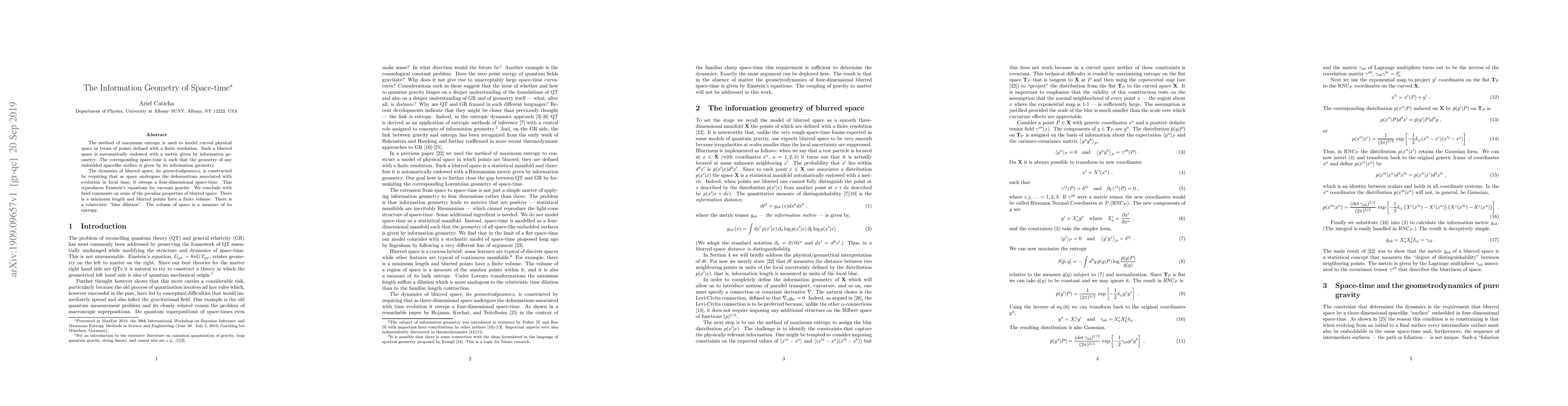 The method of maximum entropy is used to model curved physical space in terms of points defined with a finite resolution. Such a blurred space is automatically endowed with a metric given by information geometry. The corresponding space-time is such that the geometry of any embedded spacelike surface is given by its information geometry. The dynamics of blurred space, its geometrodynamics, is constructed by requiring that as space undergoes the deformations associated with evolution in local time, it sweeps a four-dimensional space-time. This reproduces Einstein's equations for vacuum gravity. We conclude with brief comments on some of the peculiar properties of blurred space: There is a minimum length and blurred points have a finite volume. There is a relativistic "blur dilation". The volume of space is a measure of its entropy.