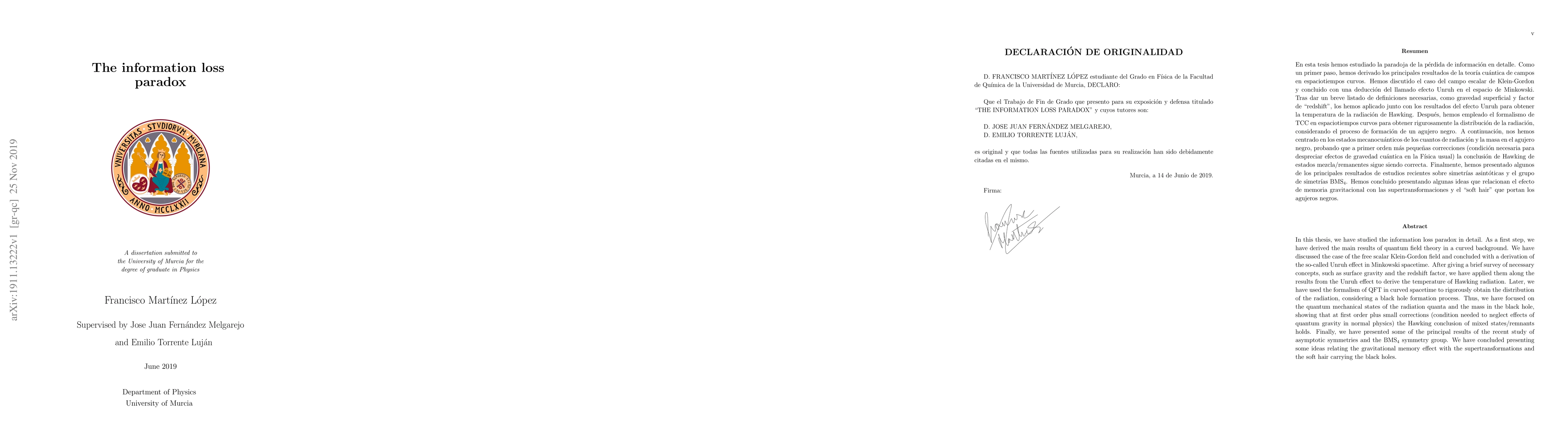 In this thesis, we have studied the information loss paradox in detail. As a first step, we have derived the main results of quantum field theory in a curved background. We have discussed the case of the free scalar Klein-Gordon field and concluded with a derivation of the so-called Unruh effect in Minkowski spacetime. After giving a brief survey of necessary concepts, such as surface gravity and the redshift factor, we have applied them along the results from the Unruh effect to derive the temperature of Hawking radiation. Later, we have used the formalism of QFT in curved spacetime to rigorously obtain the distribution of the radiation, considering a black hole formation process. Thus, we have focused on the quantum mechanical states of the radiation quanta and the mass in the black hole, showing that at first order plus small corrections (condition needed to neglect effects of quantum gravity in normal physics) the Hawking conclusion of mixed states/remnants holds. Finally, we have presented some of the principal results of the recent study of asymptotic symmetries and the $BMS_4$ symmetry group. We have concluded presenting some ideas relating the gravitational memory effect with the supertransformations and the soft hair carrying the black holes.