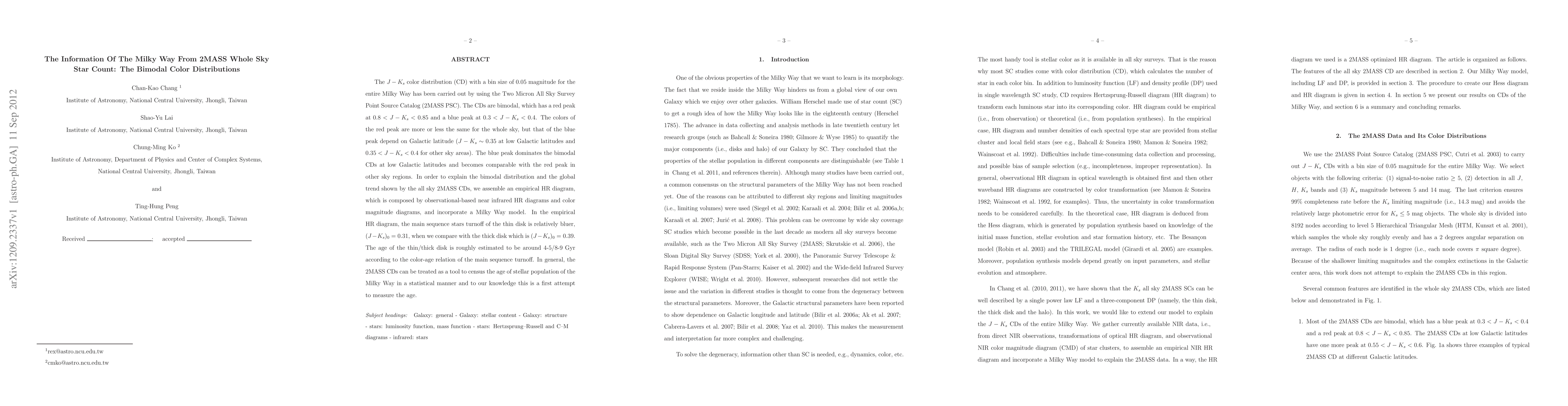 The 2MASS survey reveals bimodal J-Ks color distributions in the Milky Way, with a red peak around 0.8 < J-Ks < 0.85 and a blue peak around 0.3 < J-Ks < 0.4. The study uses an empirical HR diagram to suggest that thin disk stars are bluer, indicating younger ages (~4-5 Gyr), compared to thicker disk stars (~8-9 Gyr).