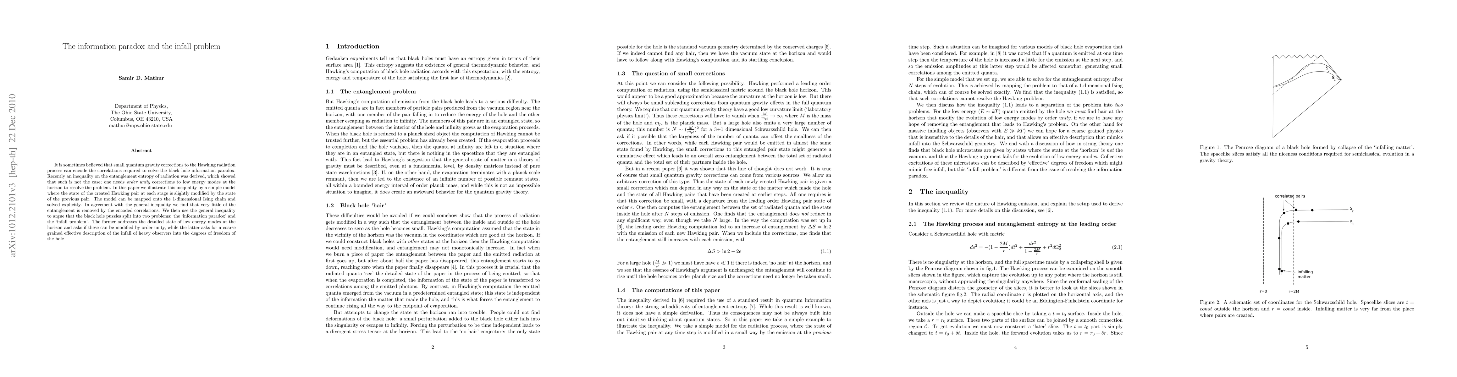 It is sometimes believed that small quantum gravity corrections to the Hawking radiation process can encode the correlations required to solve the black hole information paradox. Recently an inequality on the entanglement entropy of radiation was derived, which showed that such is not the case; one needs {\it order unity} corrections to low energy modes at the horizon to resolve the problem. In this paper we illustrate this inequality by a simple model where the state of the created Hawking pair at each stage is slightly modified by the state of the previous pair. The model can be mapped onto the 1-dimensional Ising chain and solved explicitly. In agreement with the general inequality we find that very little of the entanglement is removed by the encoded correlations. We then use the general inequality to argue that the black hole puzzles split into two problems: the `information paradox' and the `infall problem'. The former addresses the detailed state of low energy modes at the horizon and asks if these can be modified by order unity, while the latter asks for a coarse grained effective description of the infall of heavy observers into the degrees of freedom of the hole.