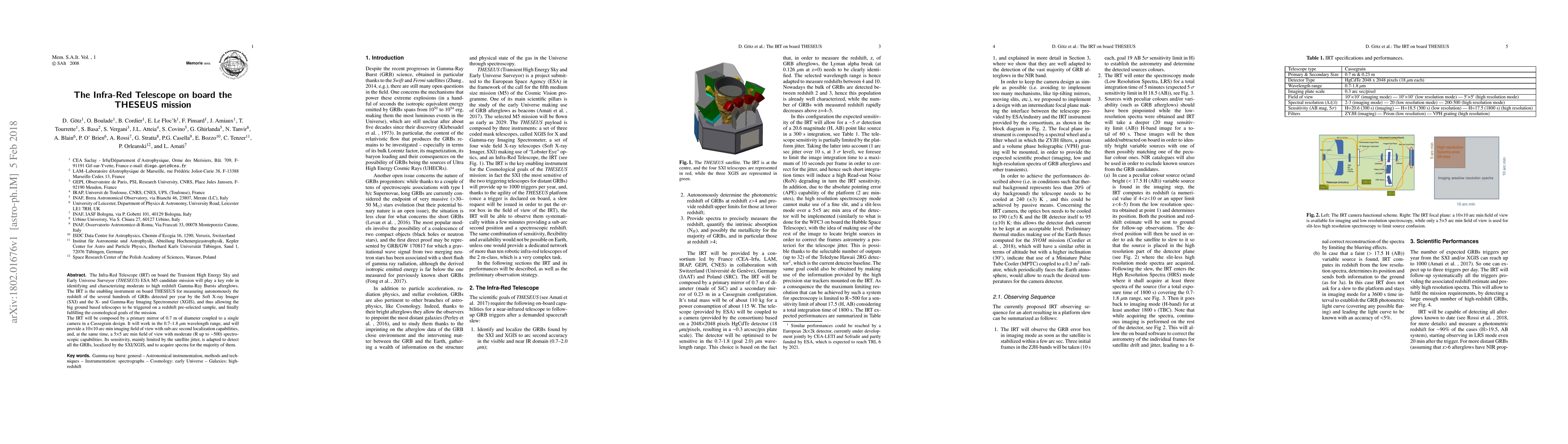 The Infra-Red Telescope (IRT) on the THESEUS mission will identify and characterize Gamma-Ray Bursts' afterglows, enabling redshift measurements for hundreds of GRBs annually, aiding ground-based telescopes and fulfilling the mission's cosmological objectives. The IRT features a 0.7 m primary mirror, operates in the 0.7-1.8 μm range, and offers both imaging and spectroscopic capabilities.