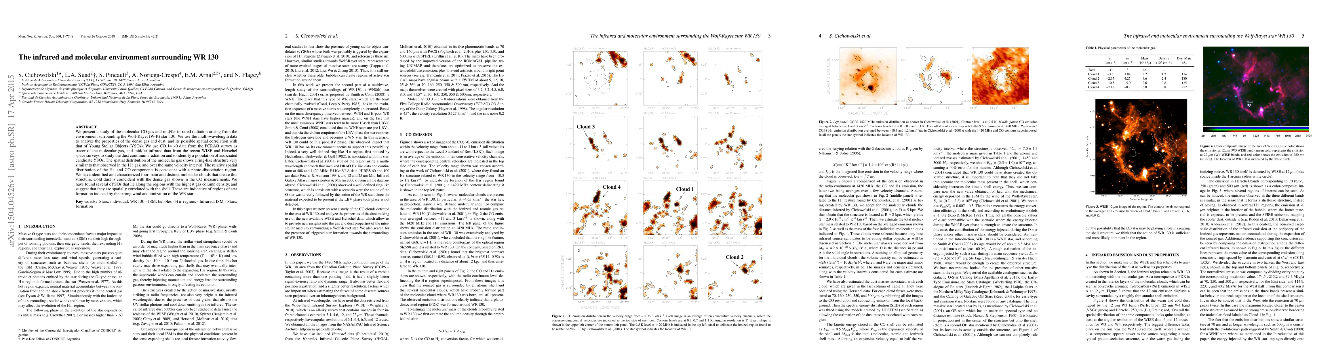 This study analyzes the molecular CO gas and infrared radiation surrounding the Wolf-Rayet star WR130, revealing a ring-like structure in the molecular gas similar to the HI gas. The research identifies four distinct molecular clouds and suggests star formation regions correlated with the star's strong wind and ionization.