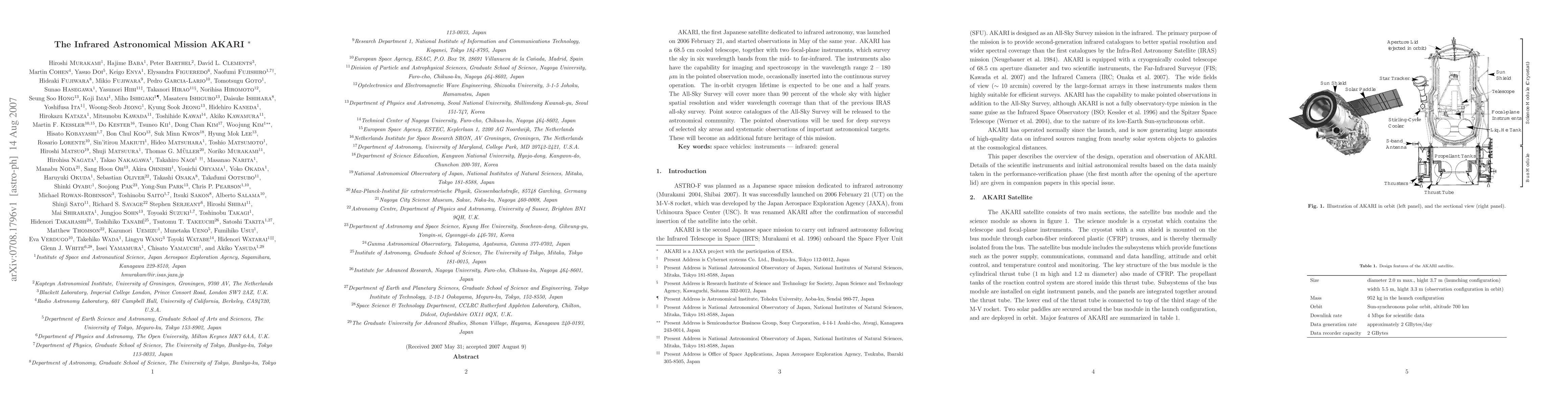 AKARI, the first Japanese satellite dedicated to infrared astronomy, was launched on 2006 February 21, and started observations in May of the same year. AKARI has a 68.5 cm cooled telescope, together with two focal-plane instruments, which survey the sky in six wavelength bands from the mid- to far-infrared. The instruments also have the capability for imaging and spectroscopy in the wavelength range 2 - 180 micron in the pointed observation mode, occasionally inserted into the continuous survey operation. The in-orbit cryogen lifetime is expected to be one and a half years. The All-Sky Survey will cover more than 90 percent of the whole sky with higher spatial resolution and wider wavelength coverage than that of the previous IRAS all-sky survey. Point source catalogues of the All-Sky Survey will be released to the astronomical community. The pointed observations will be used for deep surveys of selected sky areas and systematic observations of important astronomical targets. These will become an additional future heritage of this mission.