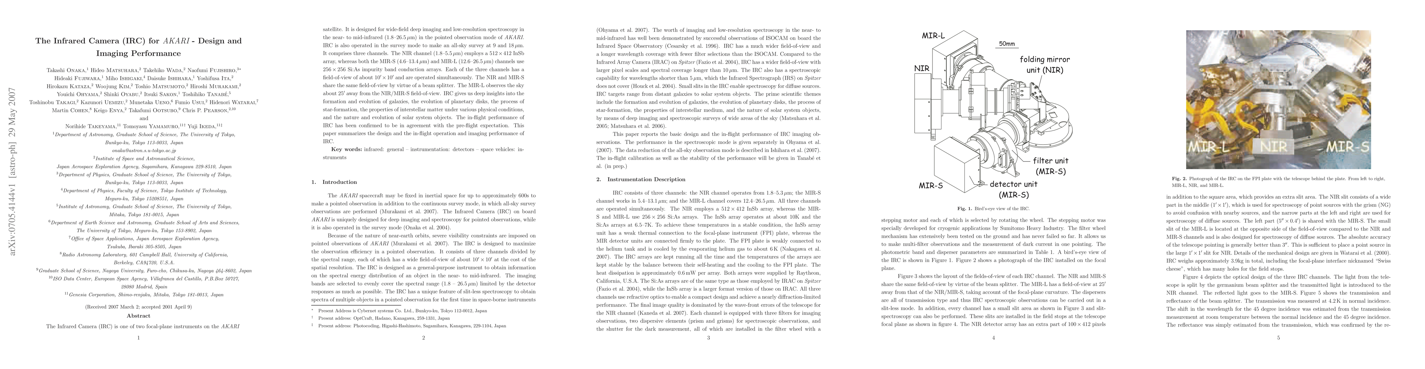 The Infrared Camera (IRC) on the AKARI satellite is designed for wide-field deep imaging and low-resolution spectroscopy in the near- to mid-infrared range. Its in-flight performance matches pre-flight expectations, providing insights into galactic and stellar evolution, and planetary disk formation.