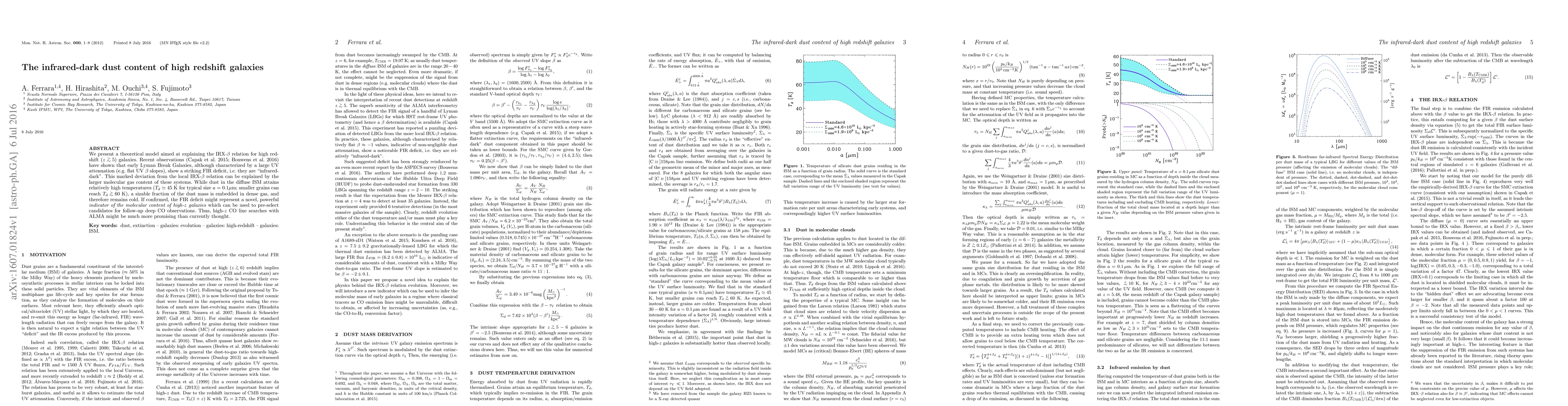 We present a theoretical model aimed at explaining the IRX-$\beta$ relation for high redshift (z >5) galaxies. Recent observations (Capak+2015; Bouwens+2016) have shown that early Lyman Break Galaxies, although characterized by a large UV attenuation (e.g. flat UV beta slopes), show a striking FIR deficit, i.e. they are "infrared-dark". This marked deviation from the local IRX-beta relation can be explained by the larger molecular gas content of these systems. While dust in the diffuse ISM attains relatively high temperatures (Td = 45 K for typical size a=0.1 um; smaller grains can reach Td = 60 K), a sizable fraction of the dust mass is embedded in dense gas, and therefore remains cold. If confirmed, the FIR deficit might represent a novel, powerful indicator of the molecular content of high-z galaxies which can be used to pre-select candidates for follow-up deep CO observations. Thus, high-z CO line searches with ALMA might be much more promising than currently thought.