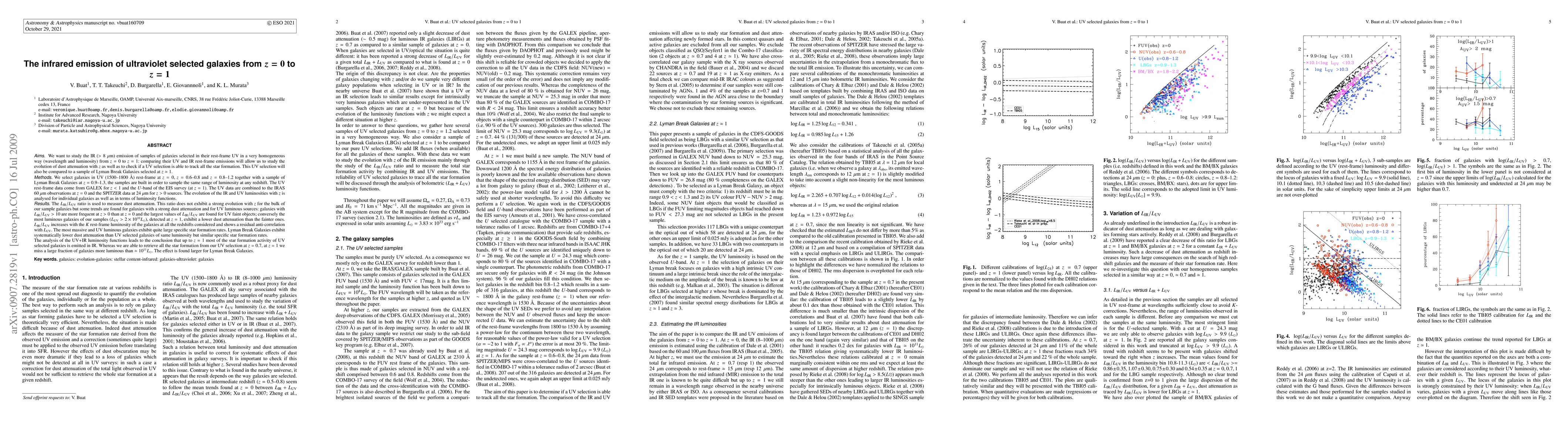This paper investigates the infrared (IR) emission of ultraviolet (UV) selected galaxies from z=0 to z=1, finding that while the L_IR/L_UV ratio does not show strong evolution with redshift for most galaxies, it indicates higher dust attenuation in more luminous galaxies at z>0. The study concludes that most UV selected galaxies' star formation activity is emitted in IR, but at z=1, a significant fraction of the most luminous galaxies are missed.
