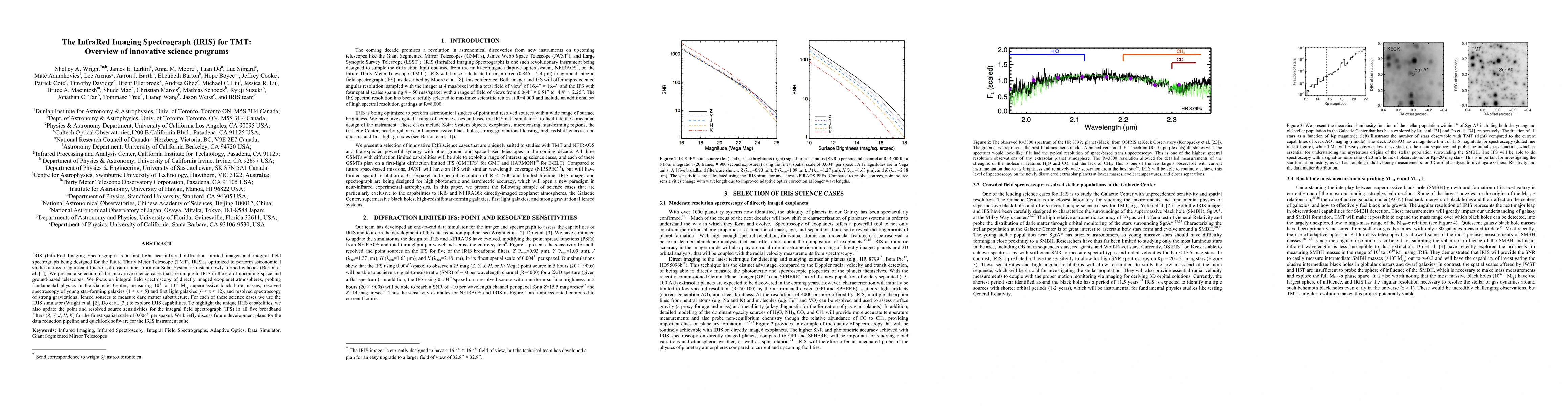 The IRIS (InfraRed Imaging Spectrograph) for the Thirty Meter Telescope (TMT) is designed for near-infrared imaging and integral field spectroscopy, enabling groundbreaking studies from exoplanet atmospheres to distant galaxies. It uniquely facilitates probing supermassive black holes, star-forming galaxies, and dark matter substructure through advanced integral field spectroscopy.