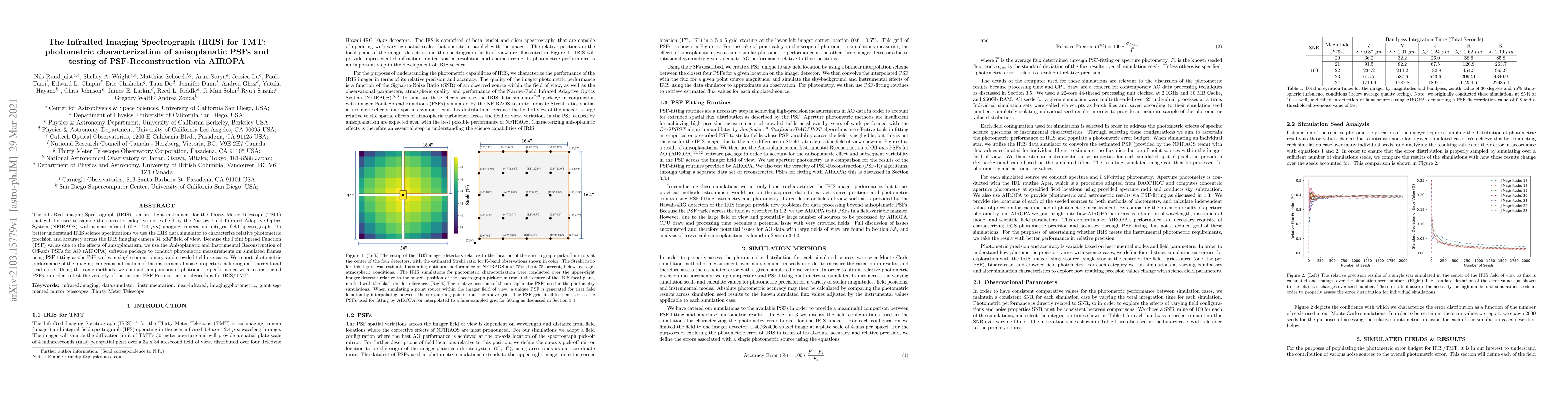 The InfraRed Imaging Spectrograph (IRIS) is a first-light instrument for the Thirty Meter Telescope (TMT) that will be used to sample the corrected adaptive optics field by the Narrow-Field Infrared Adaptive Optics System (NFIRAOS) with a near-infrared (0.8 - 2.4 $\mu$m) imaging camera and integral field spectrograph. To better understand IRIS science specifications we use the IRIS data simulator to characterize relative photometric precision and accuracy across the IRIS imaging camera 34"x34" field of view. Because the Point Spread Function (PSF) varies due to the effects of anisoplanatism, we use the Anisoplanatic and Instrumental Reconstruction of Off-axis PSFs for AO (AIROPA) software package to conduct photometric measurements on simulated frames using PSF-fitting as the PSF varies in single-source, binary, and crowded field use cases. We report photometric performance of the imaging camera as a function of the instrumental noise properties including dark current and read noise. Using the same methods, we conduct comparisons of photometric performance with reconstructed PSFs, in order to test the veracity of the current PSF-Reconstruction algorithms for IRIS/TMT.