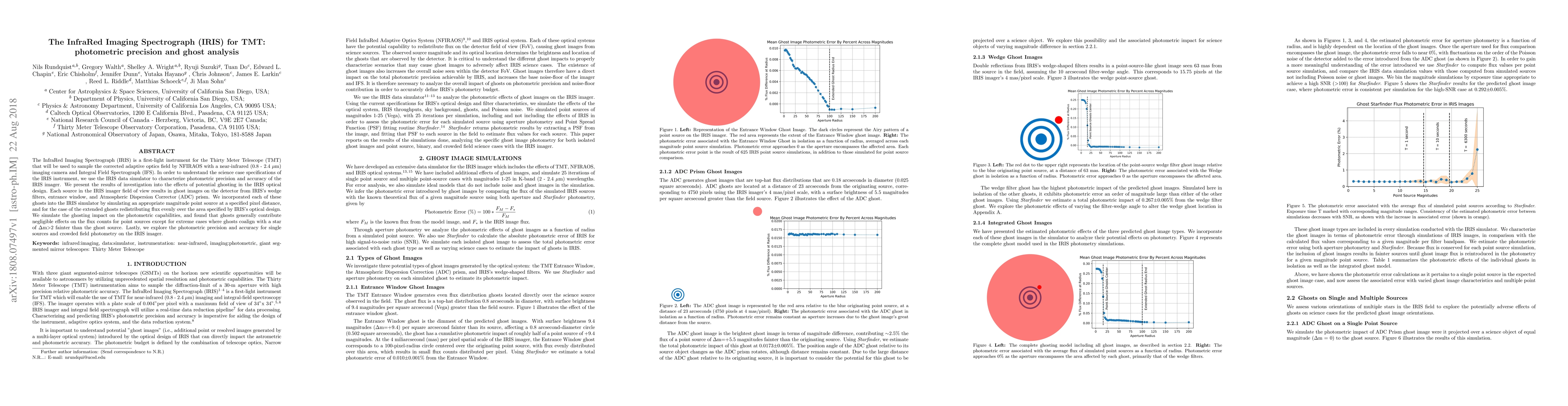 The InfraRed Imaging Spectrograph (IRIS) is a first-light instrument for the Thirty Meter Telescope (TMT) that will be used to sample the corrected adaptive optics field by NFIRAOS with a near-infrared (0.8 - 2.4 $\mu$m) imaging camera and Integral Field Spectrograph (IFS). In order to understand the science case specifications of the IRIS instrument, we use the IRIS data simulator to characterize photometric precision and accuracy of the IRIS imager. We present the results of investigation into the effects of potential ghosting in the IRIS optical design. Each source in the IRIS imager field of view results in ghost images on the detector from IRIS's wedge filters, entrance window, and Atmospheric Dispersion Corrector (ADC) prism. We incorporated each of these ghosts into the IRIS simulator by simulating an appropriate magnitude point source at a specified pixel distance, and for the case of the extended ghosts redistributing flux evenly over the area specified by IRIS's optical design. We simulate the ghosting impact on the photometric capabilities, and found that ghosts generally contribute negligible effects on the flux counts for point sources except for extreme cases where ghosts coalign with a star of $\Delta$m$>$2 fainter than the ghost source. Lastly, we explore the photometric precision and accuracy for single sources and crowded field photometry on the IRIS imager.
