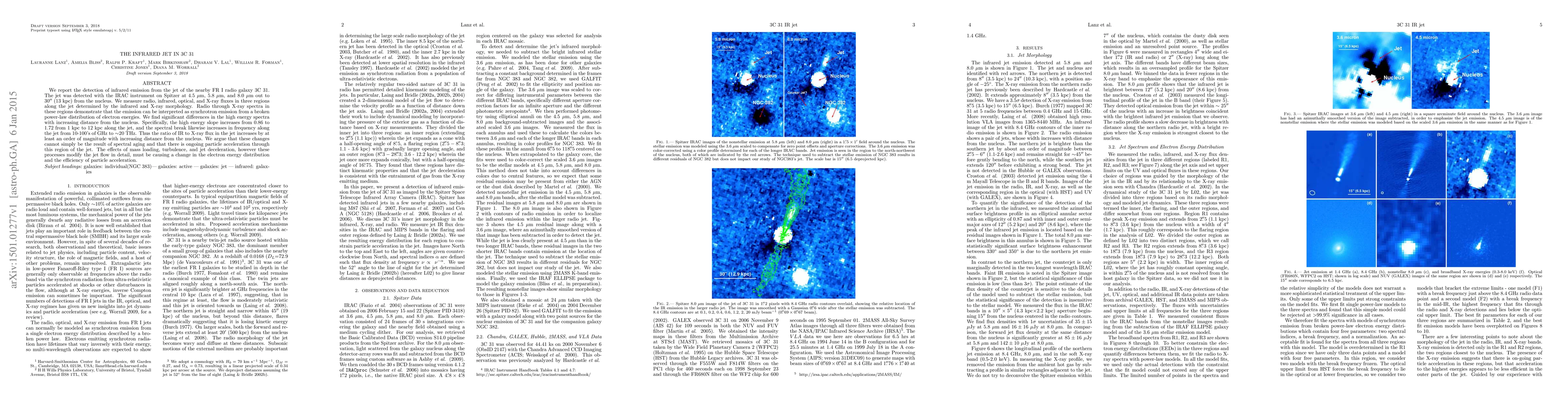 We report the detection of infrared emission from the jet of the nearby FR I radio galaxy 3C 31. The jet was detected with the IRAC instrument on Spitzer at 4.5 micron, 5.8 micron, and 8.0 micron out to 30" (13 kpc) from the nucleus. We measure radio, infrared, optical, and X-ray fluxes in three regions along the jet determined by the infrared and X-ray morphology. Radio through X-ray spectra in these regions demonstrate that the emission can be interpreted as synchrotron emission from a broken power-law distribution of electron energies. We find significant differences in the high energy spectra with increasing distance from the nucleus. Specifically, the high energy slope increases from 0.86 to 1.72 from 1 kpc to 12 kpc along the jet, and the spectral break likewise increases in frequency along the jet from 10-100's of GHz to ~20 THz. Thus the ratio of IR to X-ray flux in the jet increases by at least an order of magnitude with increasing distance from the nucleus. We argue that these changes cannot simply be the result of spectral aging and that there is ongoing particle acceleration through this region of the jet. The effects of mass loading, turbulence, and jet deceleration, however these processes modify the jet flow in detail, must be causing a change in the electron energy distribution and the efficiency of particle acceleration.