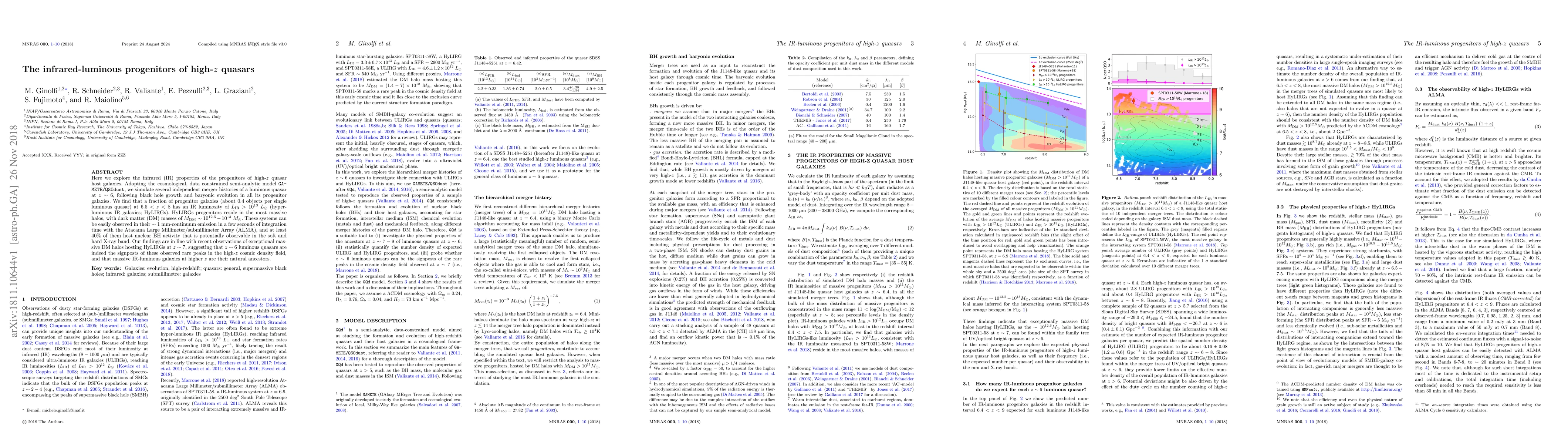 This research uses the GAMETE/QSOdust model to simulate quasar progenitors at z ~ 6, finding that about 0.4 objects per quasar are hyper-luminous IR galaxies (HyLIRGs) residing in massive dark matter halos (M_DM ~ 10^12.5 - 10^13 Msun). These HyLIRG progenitors could be observable with ALMA and X-ray telescopes, supporting the idea that massive IR-luminous galaxies at higher redshifts are their ancestors.