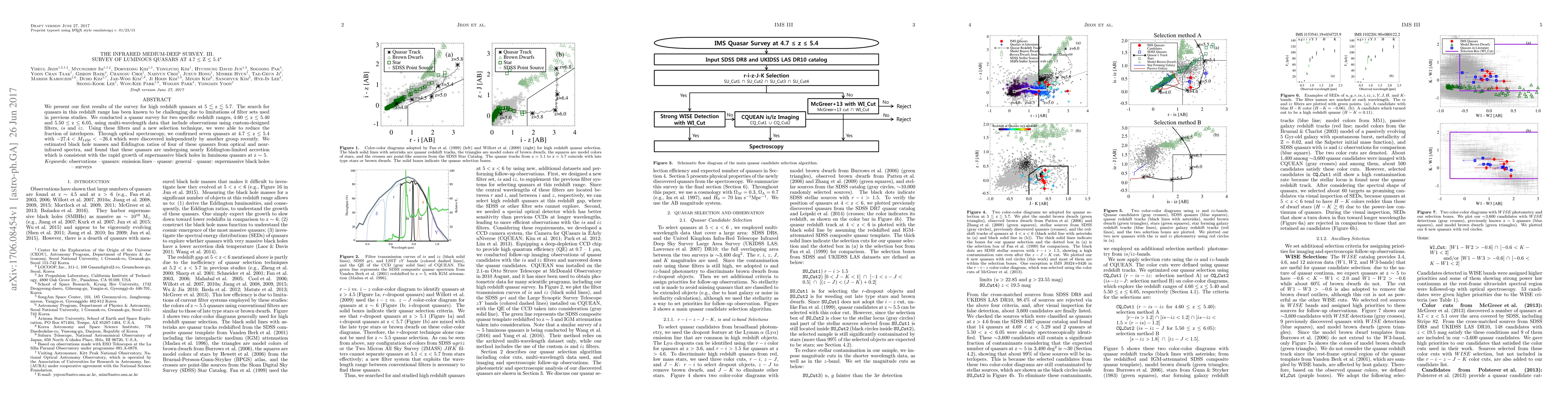 We present our first results of the survey for high redshift quasars at $5 \lesssim {\rm z} \lesssim 5.7$. The search for quasars in this redshift range has been known to be challenging due to limitations of filter sets used in previous studies. We conducted a quasar survey for two specific redshift ranges, 4.60 $\leq$ z $\leq$ 5.40 and 5.50 $\leq$ z $\leq$ 6.05, using multi-wavelength data that include observations using custom-designed filters, $is$ and $iz$. Using these filters and a new selection technique, we were able to reduce the fraction of interlopers. Through optical spectroscopy, we confirmed seven quasars at 4.7 $\leq$ z $\leq$ 5.4 with $-27.4 < M_{1450} < -26.4$ which were discovered independently by another group recently. We estimated black hole masses and Eddington ratios of four of these quasars from optical and near-infrared spectra, and found that these quasars are undergoing nearly Eddington-limited accretion which is consistent with the rapid growth of supermassive black holes in luminous quasars at z $\sim$ 5.