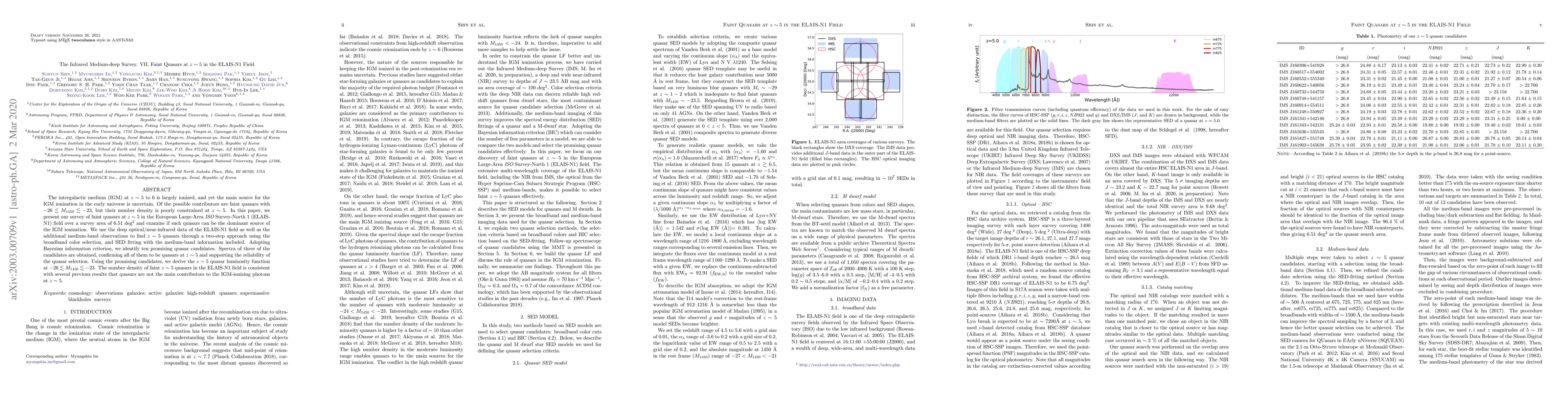 This paper surveys faint quasars at $z \sim 5$ in the ELAIS-N1 field, identifying ten candidates through optical/near-infrared data and medium-band observations. The study confirms three quasars, supporting the reliability of the selection method, and concludes that faint quasars are unlikely to be the main sources of intergalactic medium ionization at $z \sim 5$.
