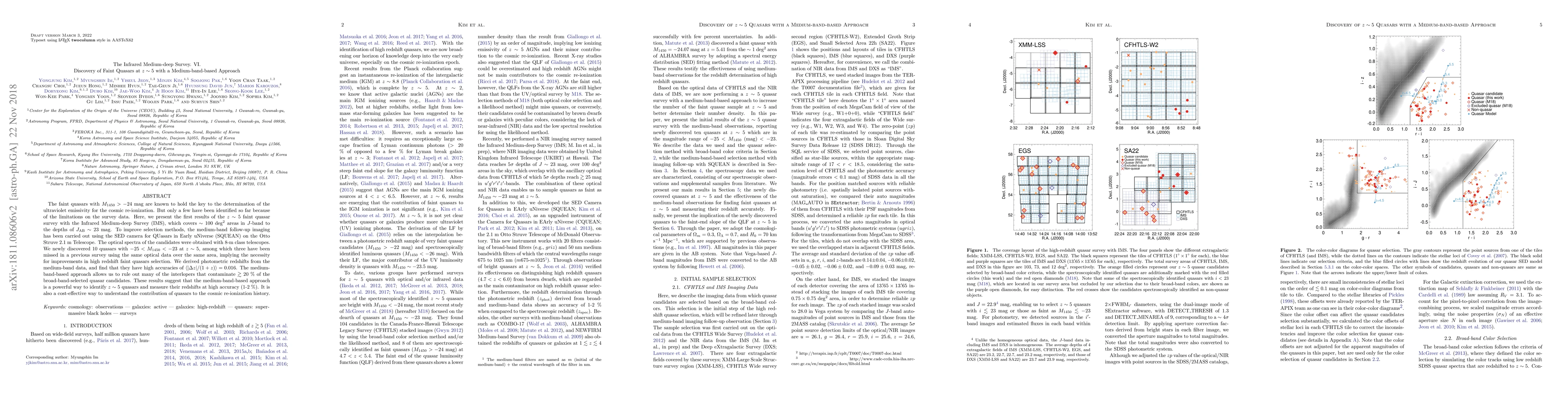 The Infrared Medium-deep Survey (IMS) discovered 10 faint quasars at $z\sim5$ using a medium-band approach, significantly improving the identification of high-redshift quasars over broad-band methods. This technique offers high accuracy in redshift determination and reduces interloper contamination.