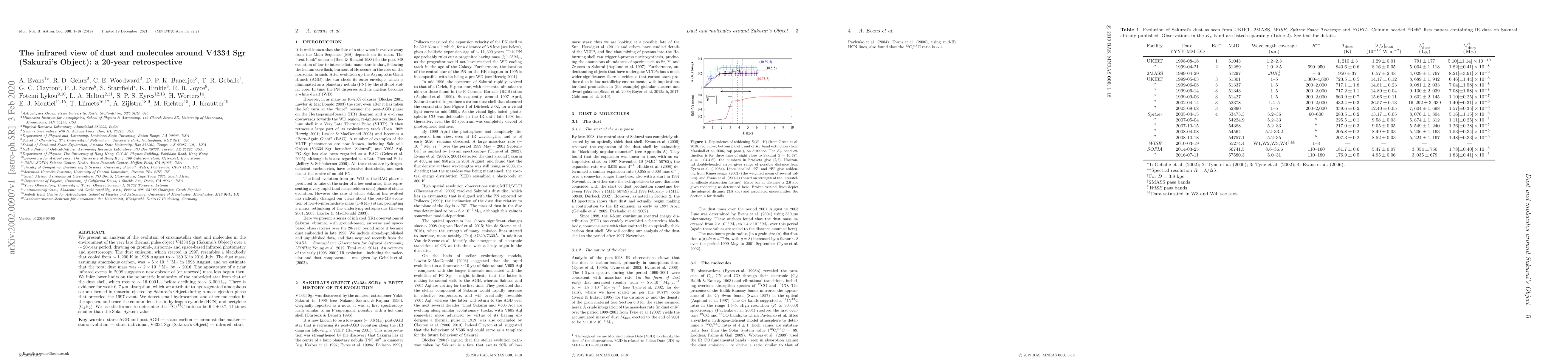 This paper analyzes the evolution of circumstellar dust and molecules around V4334 Sgr (Sakurai's Object) over 20 years, revealing a cooling dust emission from 1200K to 180K and an increase in dust mass from $5\times10^{-10}$M$_\odot$ to $2\times10^{-5}$M$_\odot$. A new mass loss episode began in 2008, and the star's bolometric luminosity peaked at 16000L$_\odot$ before declining.